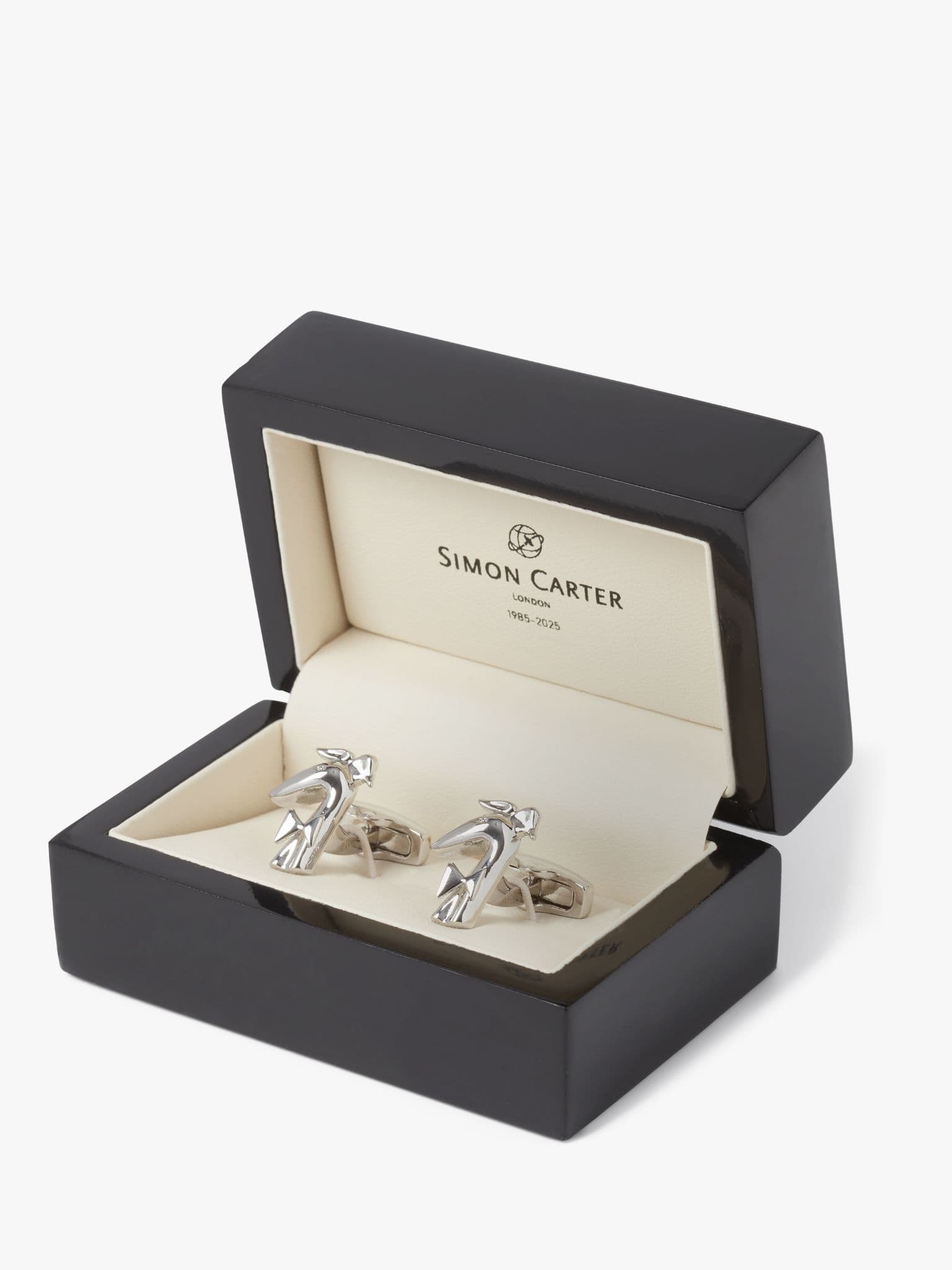 I can’t really believe that it’s been 40 years since I started my brand from a journey up and down Chelsea’s Kings Road in 1985. I was young and idealistic then. Cufflinks were one of the first products in the range all those years ago, and Gervaise, my trusty imaginary greyhound, has been my faithful companion along the way. So it seems fitting to pay tribute with these cute 3D models with his signature snappy bow tie. Finished in polished rhodium plate, they have the anniversary years discreetly on either side of the shank. Oh the 80’s……