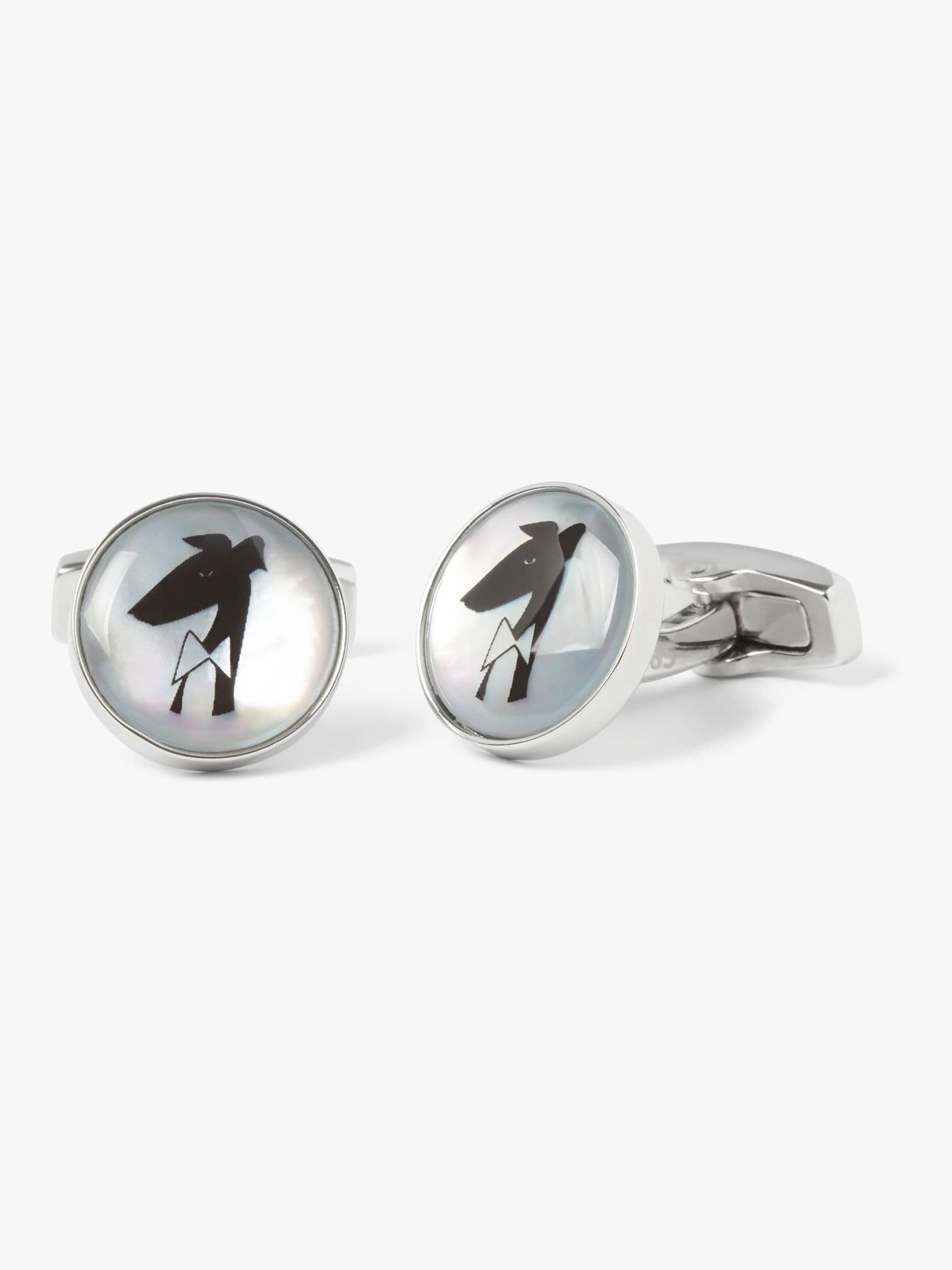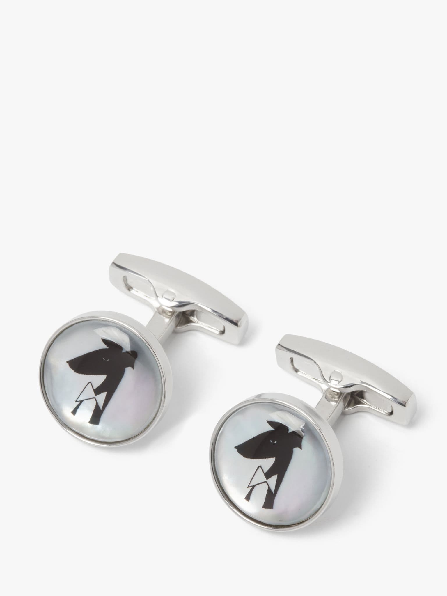 Continuing my 40th year anniversary tribute to Gervaise, my imaginary pet greyhound, are these very cute blue mother of pearl and screen print roundels. Gervaise posed patiently while we captured him in wistful mood, sporting his usual bow tie. Finished in polished rhodium plate, they have the anniversary years discreetly on either side of the shank.