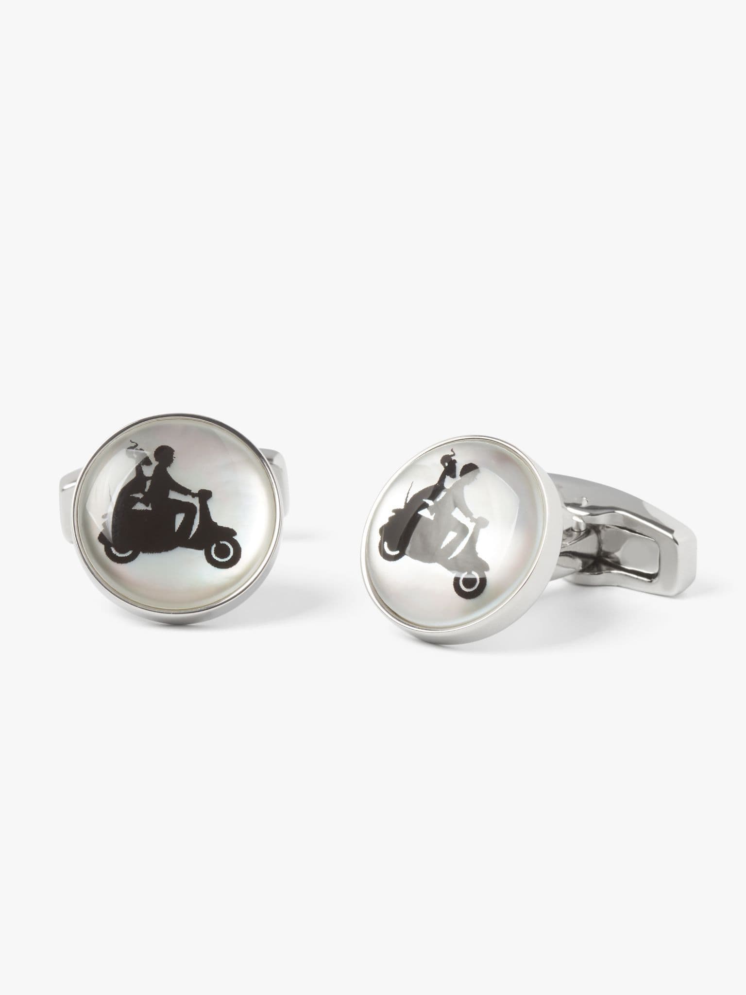 I can’t begin to tell you how many adventures we’ve got up to, and how many scrapes we’ve found ourselves in, over the last 40 years. Throughout it all, Gervaise has been my constant companion, putting up with my erratic scooter driving and capricious behaviour. He’s witnessed the brand grow from accessories to full clothing, from London to India, Tokyo, Sydney and beyond. Here’s the third in the trio of special anniversary cufflinks celebrating four decades. The screen-printed mother of pearl roundels feature my signature scooter logo and are finished in polished rhodium plate. They have the anniversary years discreetly on either side of the shank. Each pair has been approved by Gervaise…