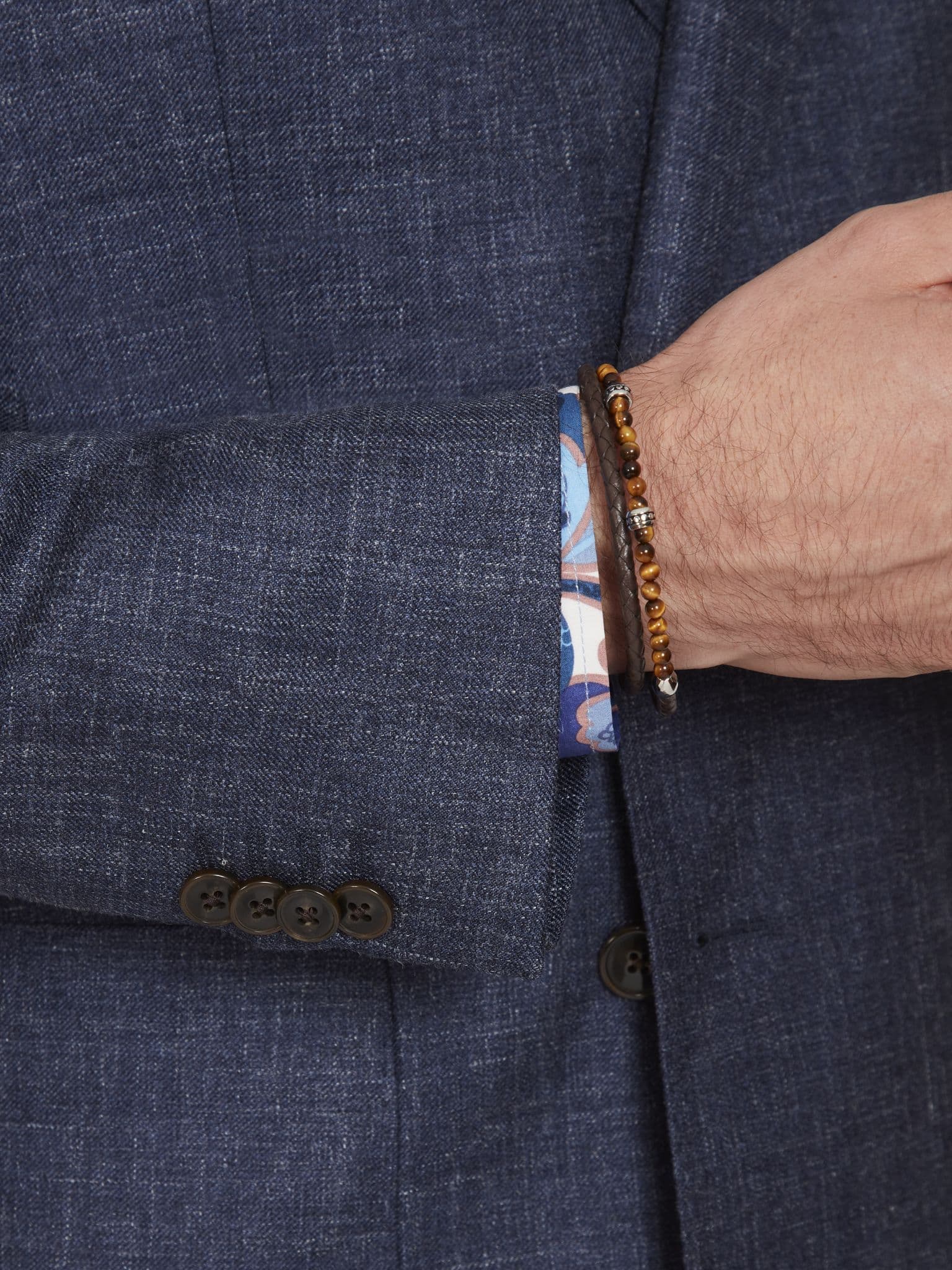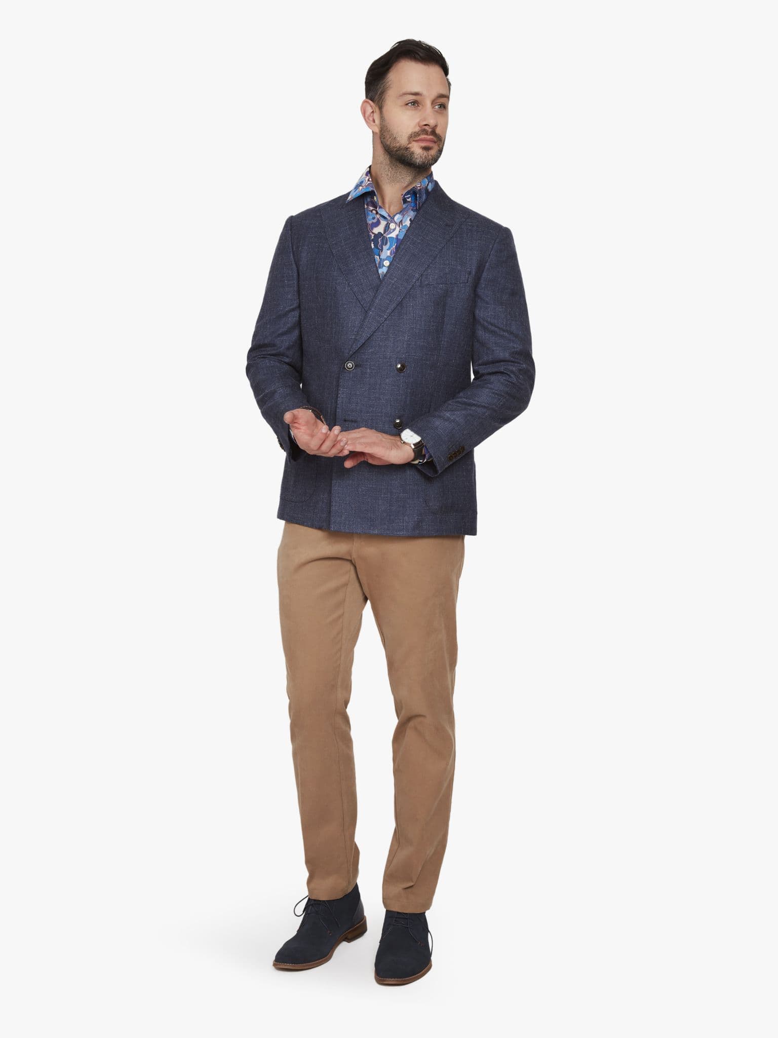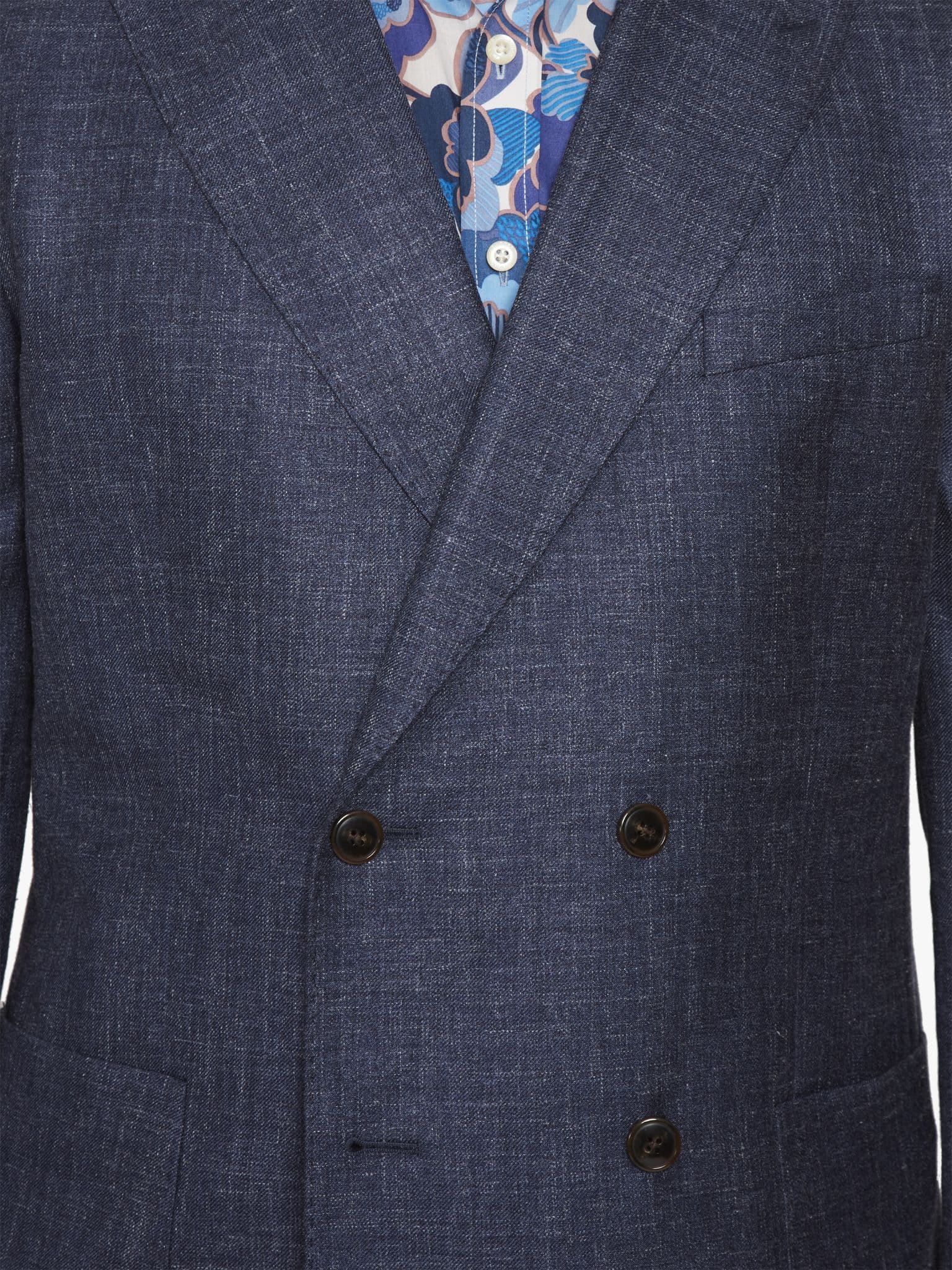 Its good to see double breasted jackets finally move into the mainstream. Never ones to be behind the curve, heres our super chic take using a wool/silk/linen blend material from Italys world renown Lanificio di Pray. I wish there was some way you could touch the screen to feel just how luxurious it feels. Weve used patch pockets on the outside just give it a more slouchy feel, and its a four button rather than six, so its all about studied elegance. Inside, the pockets are slanted to make life easier when youre fumbling for your phone. Id wear this with jeans, a polo neck and a bright pocket square. La dolce vita