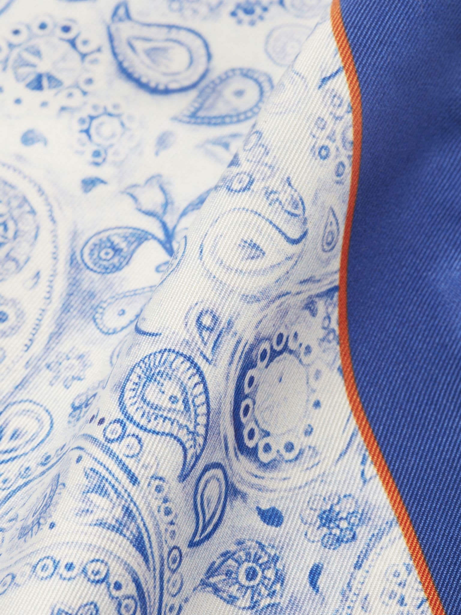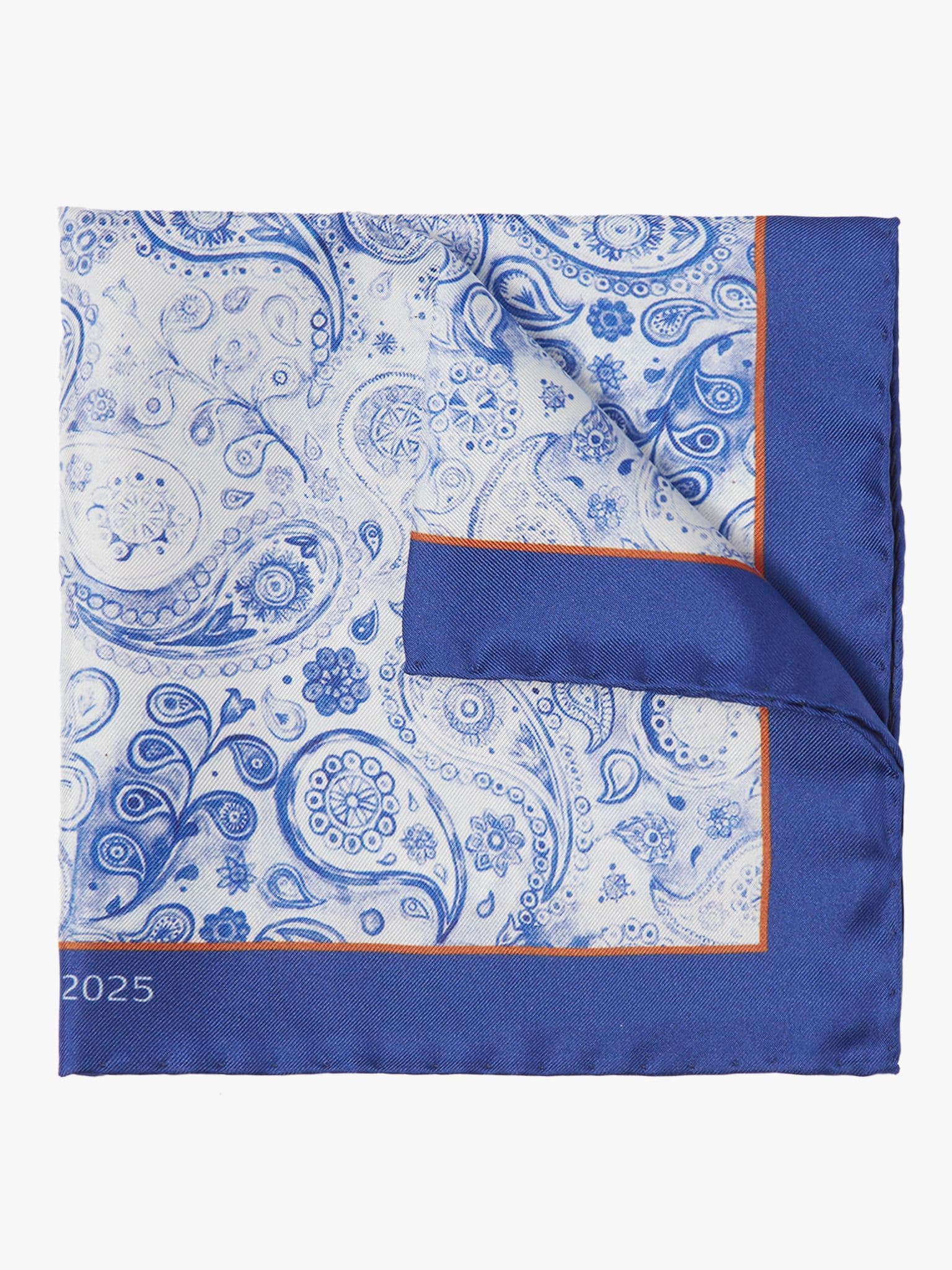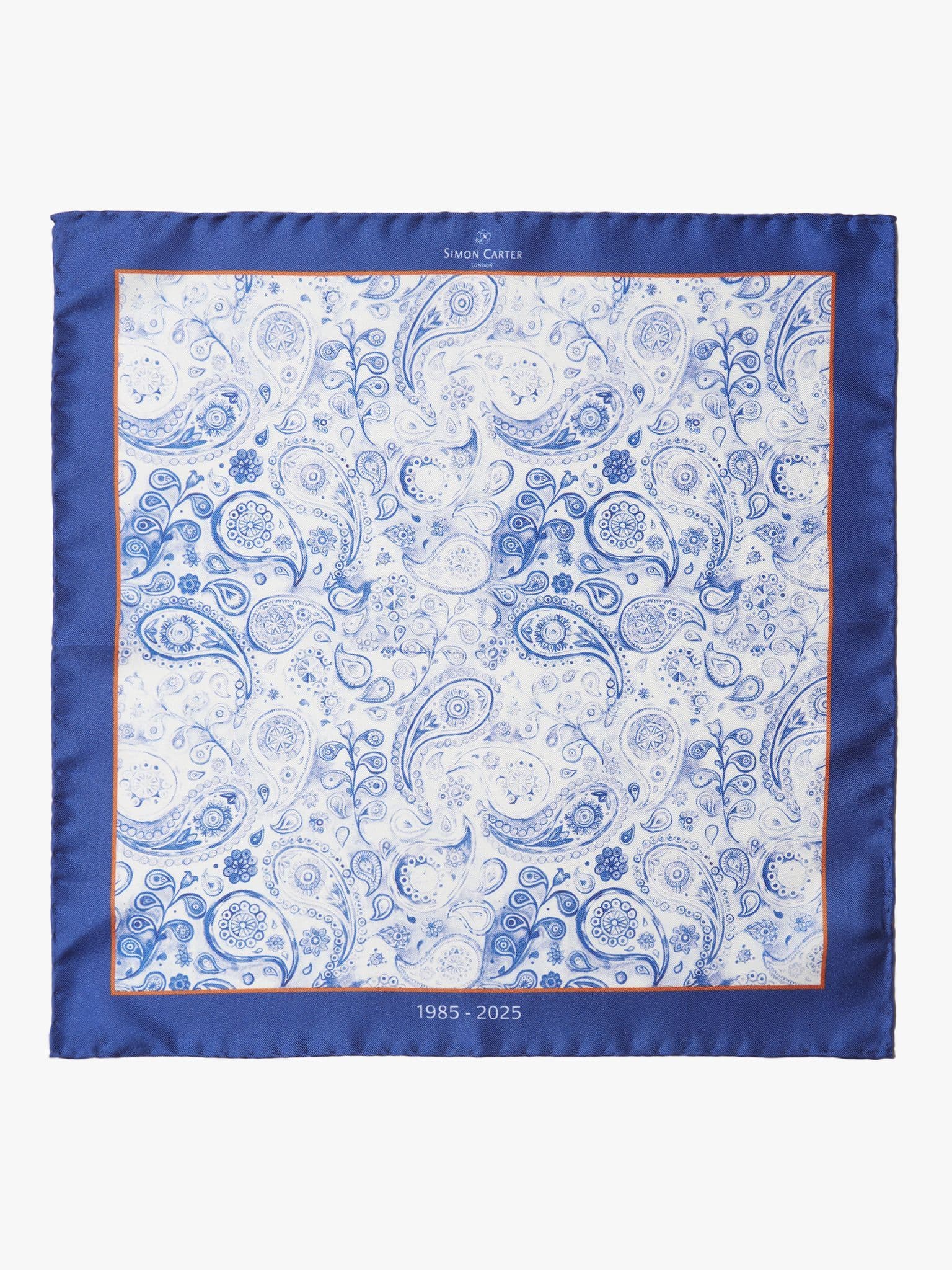 Looking back through the archive of the last 40 years, I was struck by how often we’ve used Paisley in our designs. Sometimes on shirts; occasionally on jackets; frequently as a lining for wallets or bags. This version is a tweak of our ‘House’ design, with its playful pattern of classic ogee motifs mixed with floral details. It’s easy to wear, as it’s a study in blue and white with just a hint of cinnamon at the edge. It’s part of a small collection of accessories produced to commemorate 40 years. Made in Italy from 100% silk with a hand rolled edge.