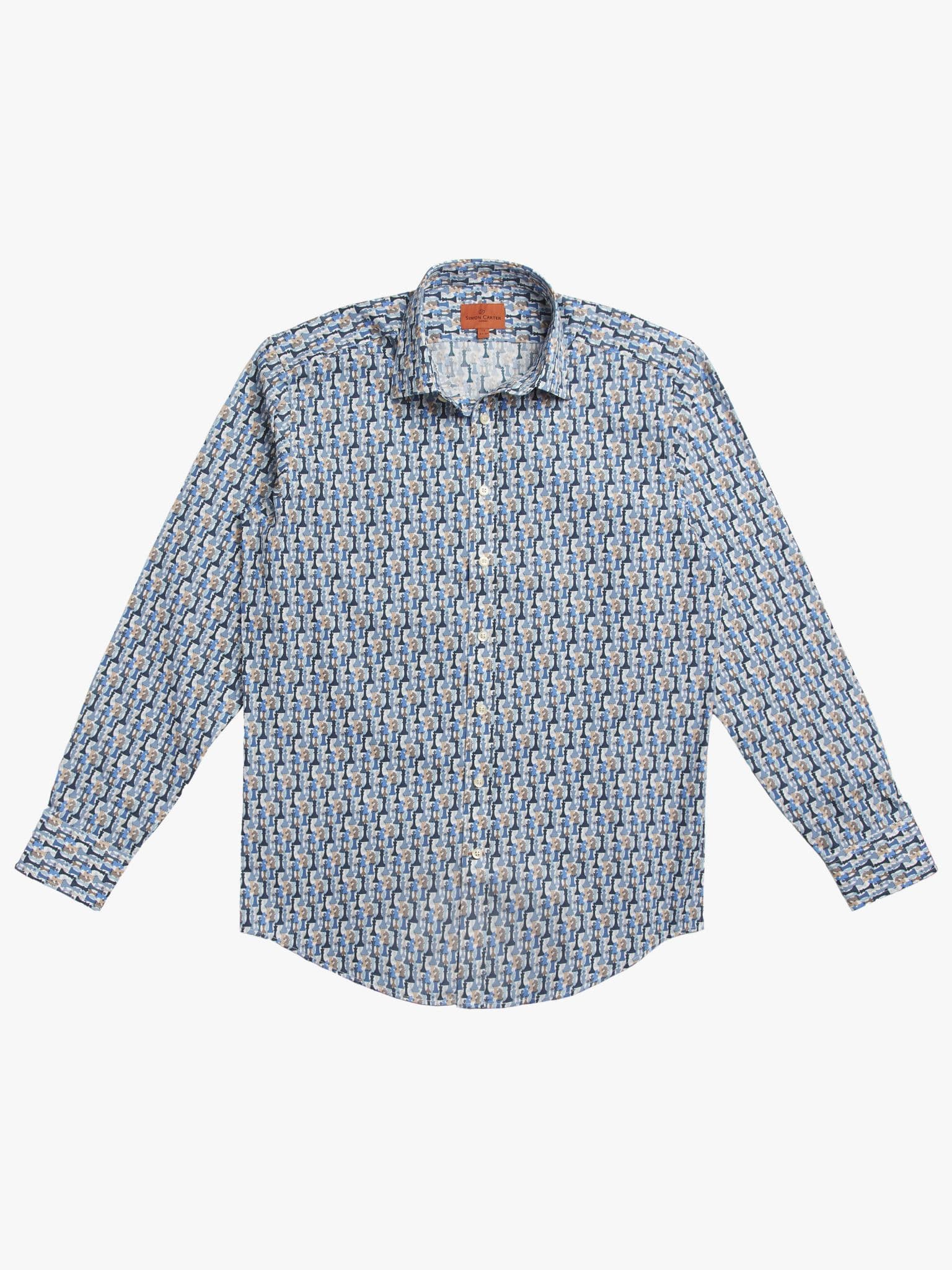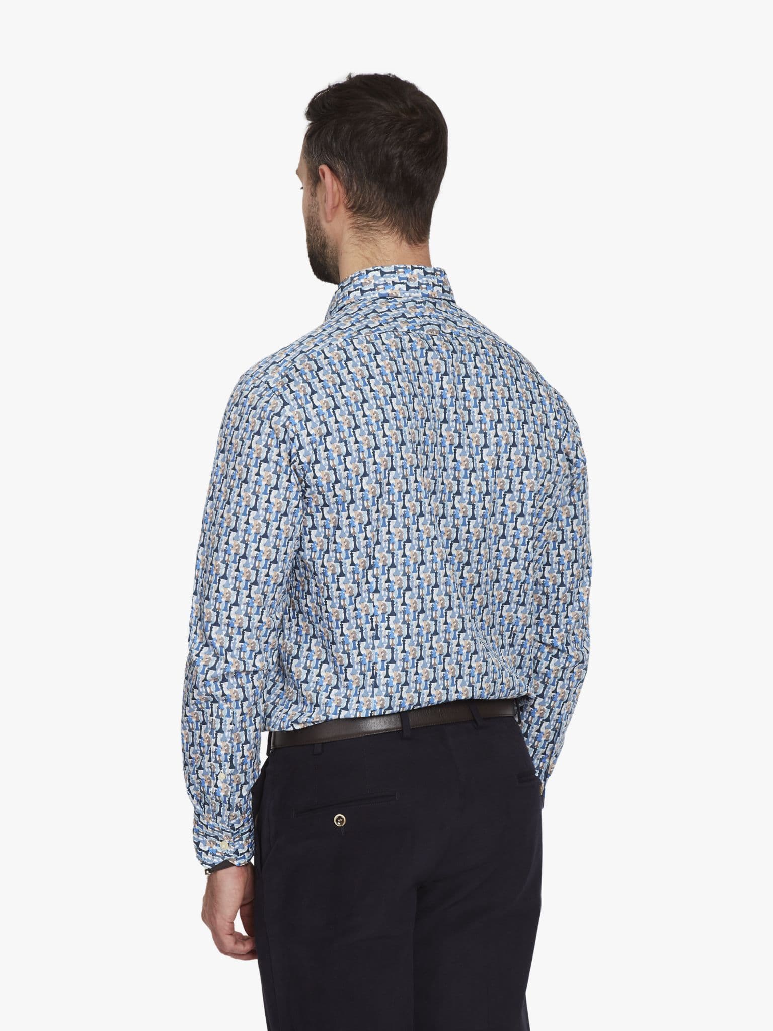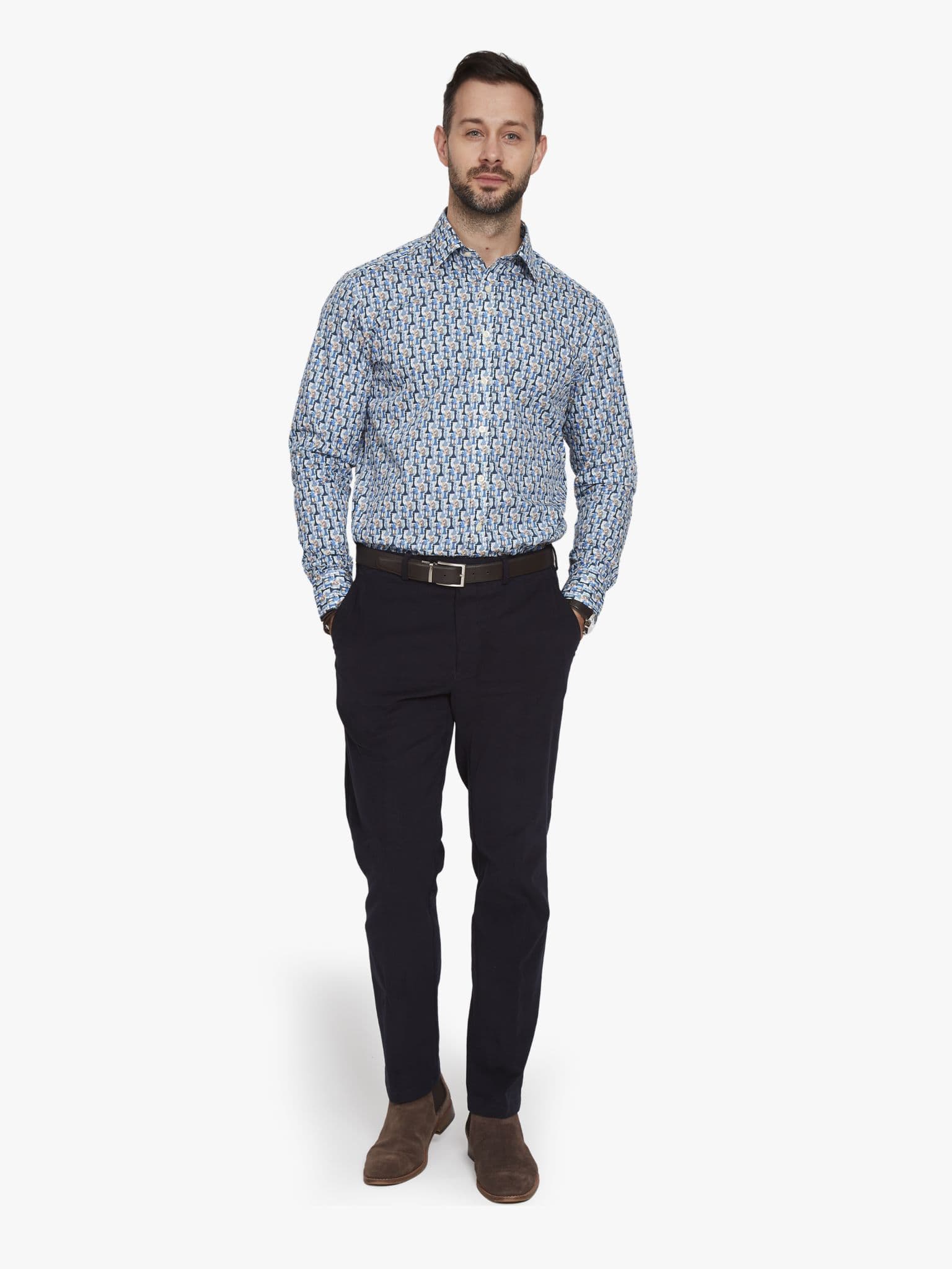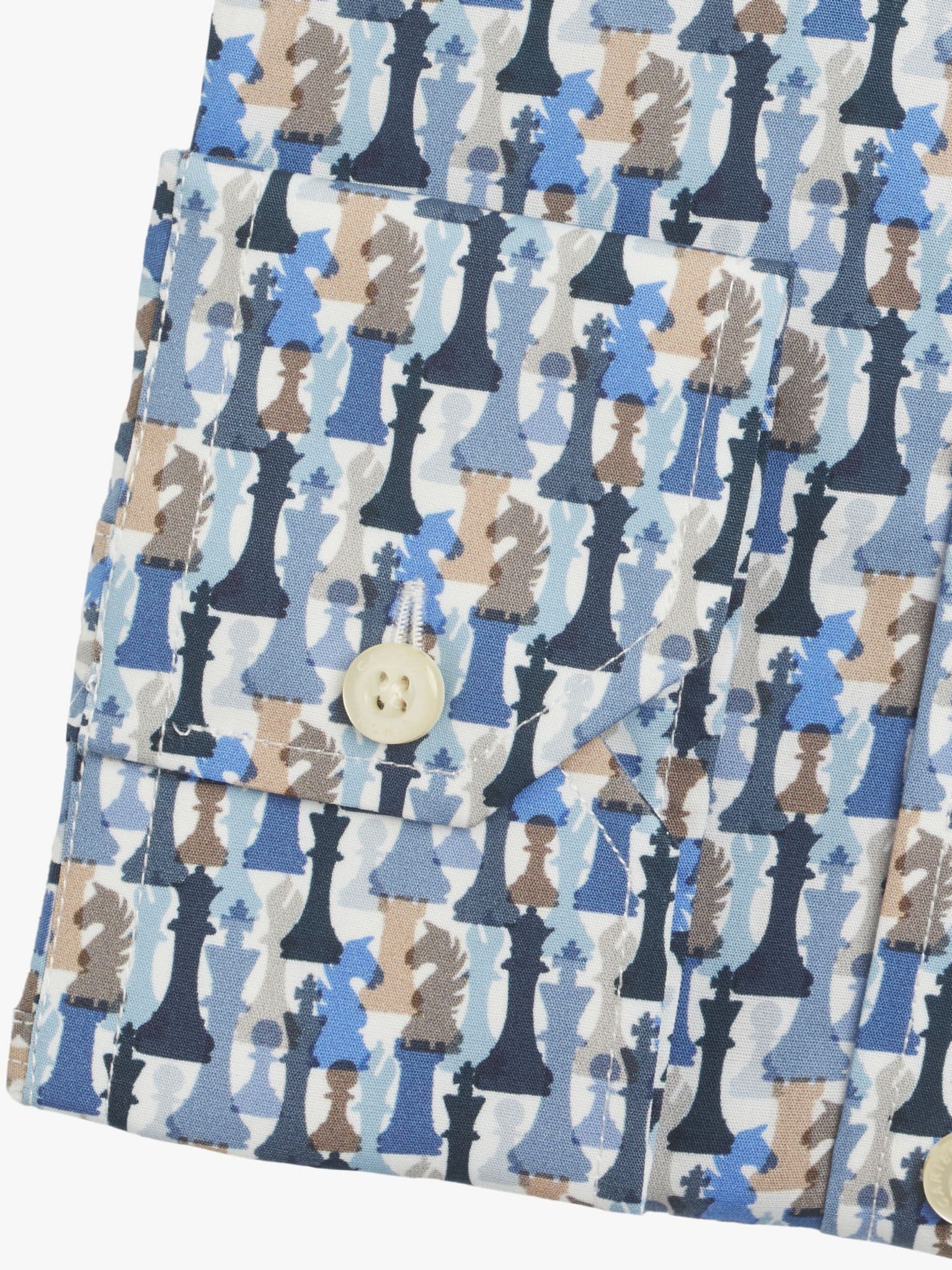 Our Chess Piece cufflinks are consistently one of our best sellers, so it seemed only logical to design a shirt to follow that. All the pieces are represented though the King and Queen stand out more as they're in a deep indigo blue. I like the mixture of colours and shade. It adds movement and depth of field. The tan hues make this great to wear with chinos or cords. What are you waiting for? Its your move..Made in Portugal from 100% cotton and cut with a gently tailored fit.