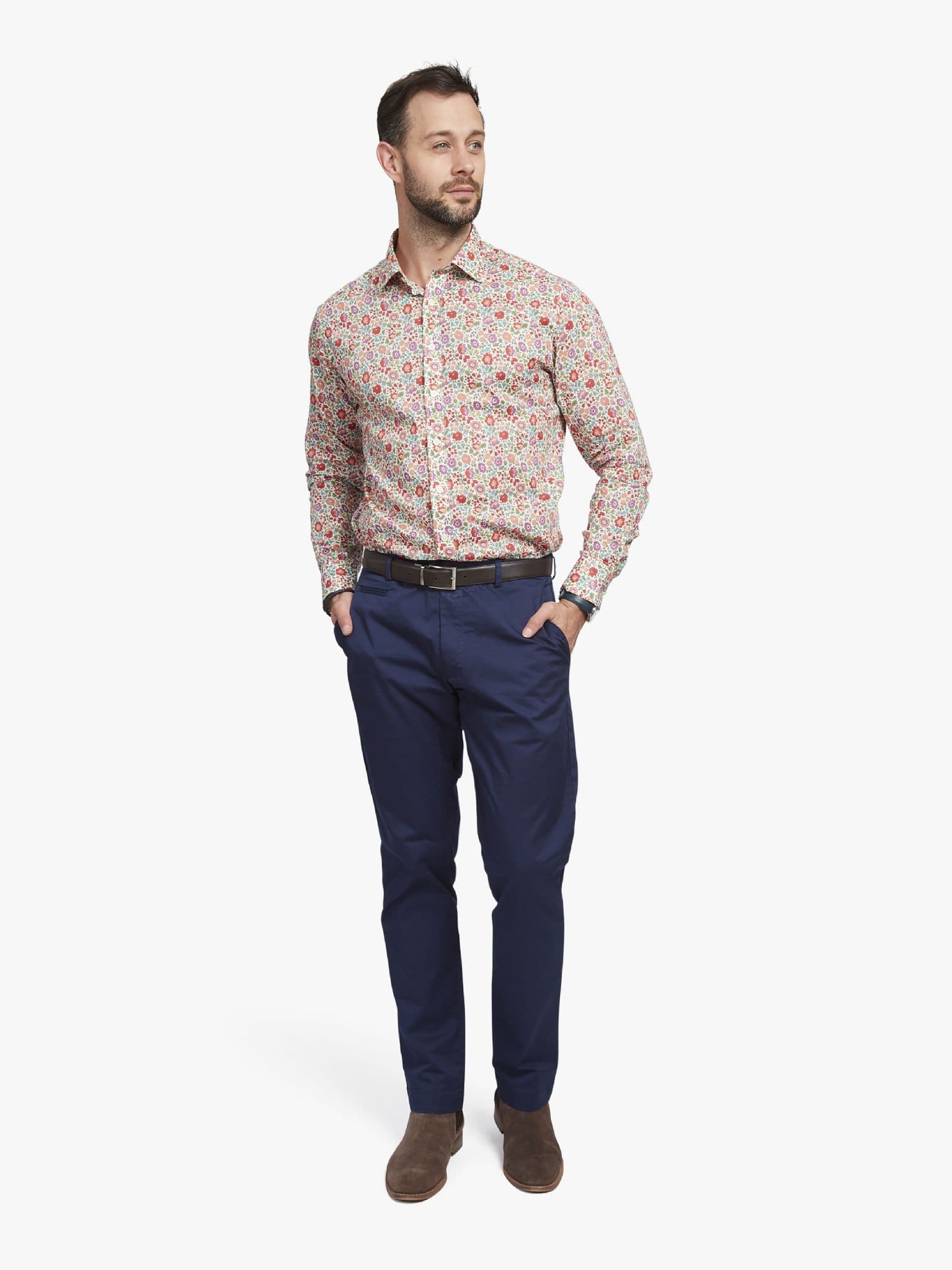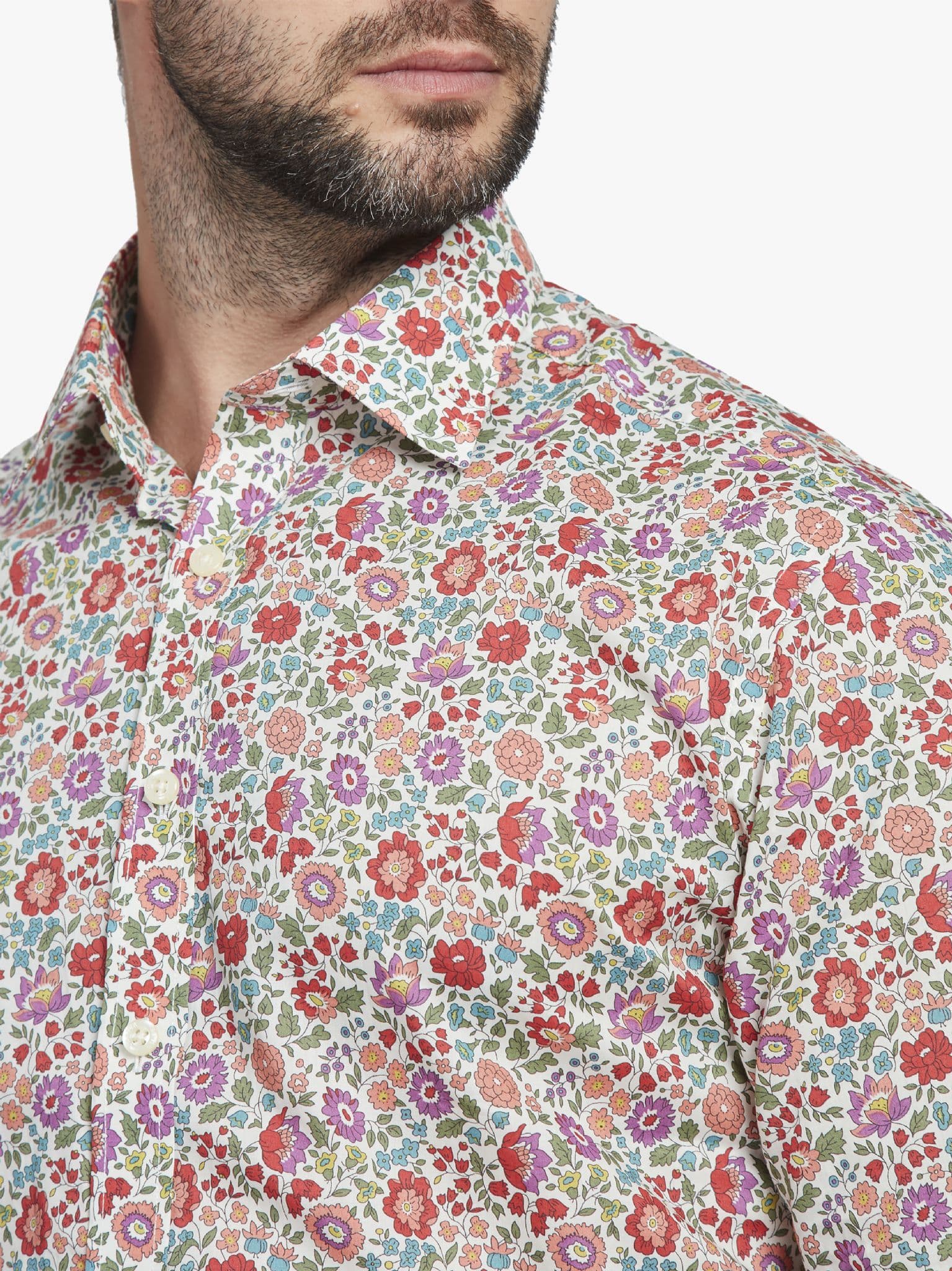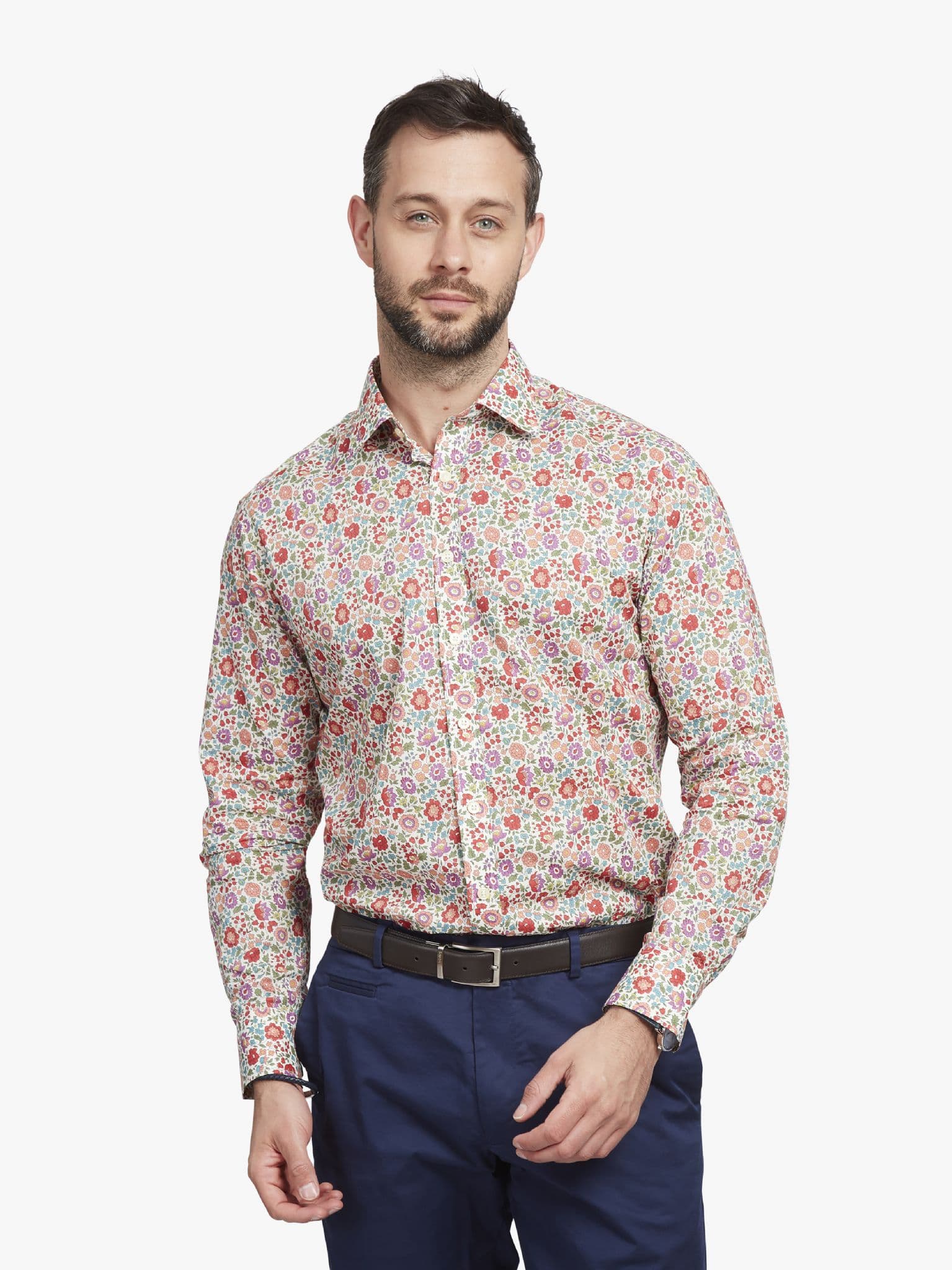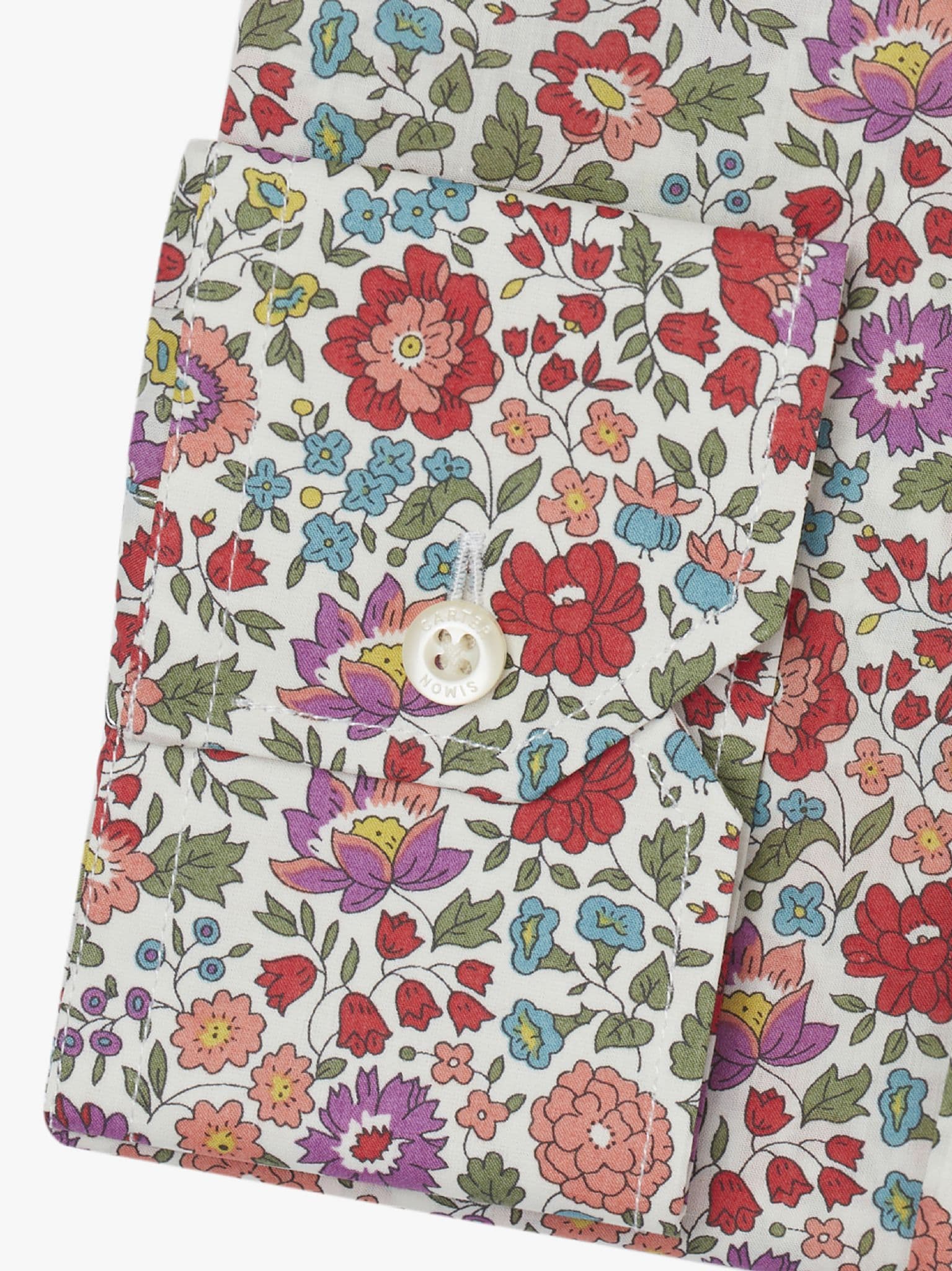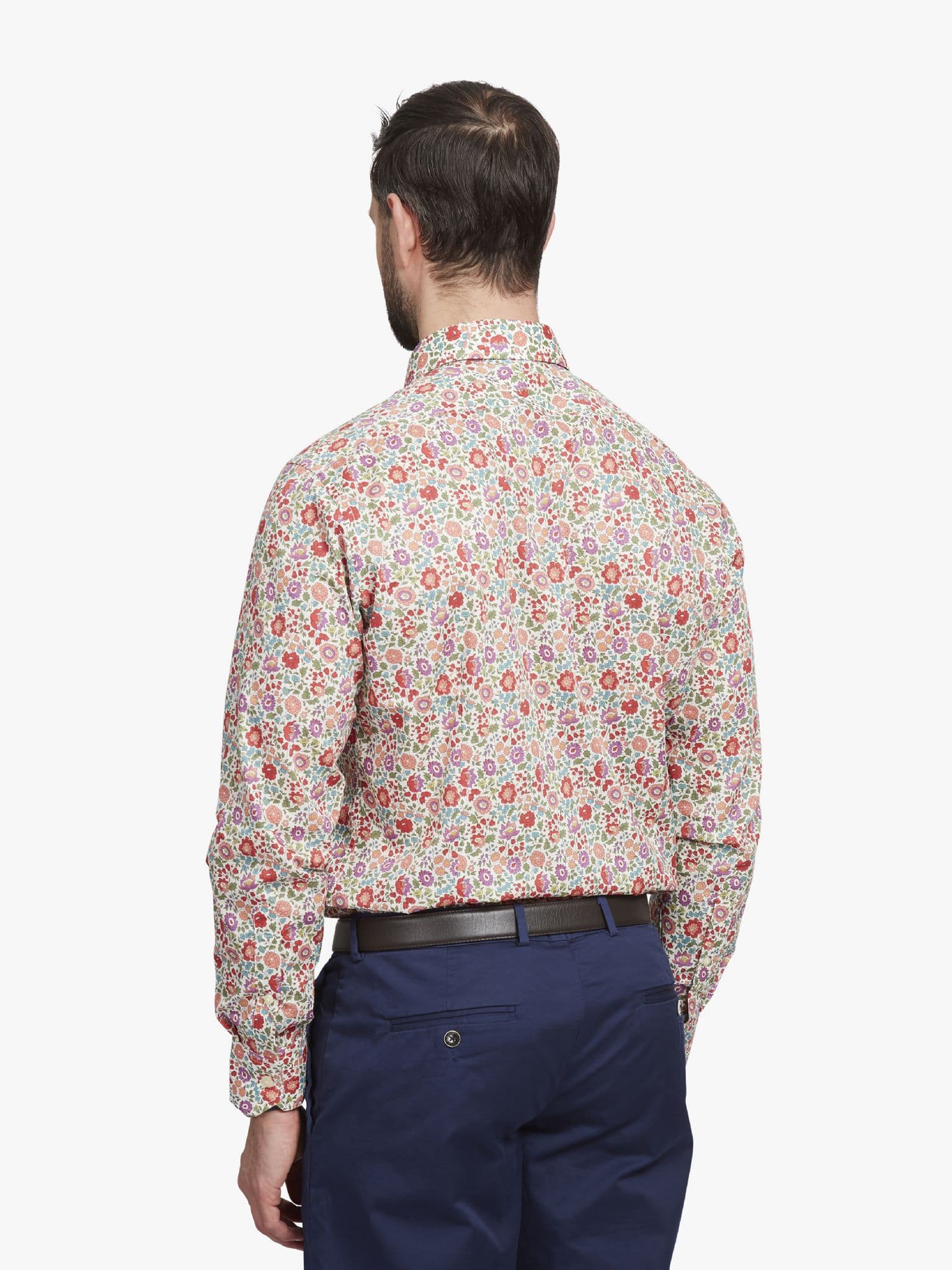 Here's a true Liberty classic. First designed in the 1940s by Silver Studio, it contains all the hallmarks you'd expect. There are neat floral sprigs, set in a careful mosaic with just the right amount of space, and a beautiful fluidity. The colours are spot on, too, with pops of purple against the greens, reds and pinks. I like the vintage feel here. Made from Liberty fabric, using their famous super-soft Tana Lawn® from their Italian mill. 100% cotton, manufactured in Portugal with a gently tailored fit.