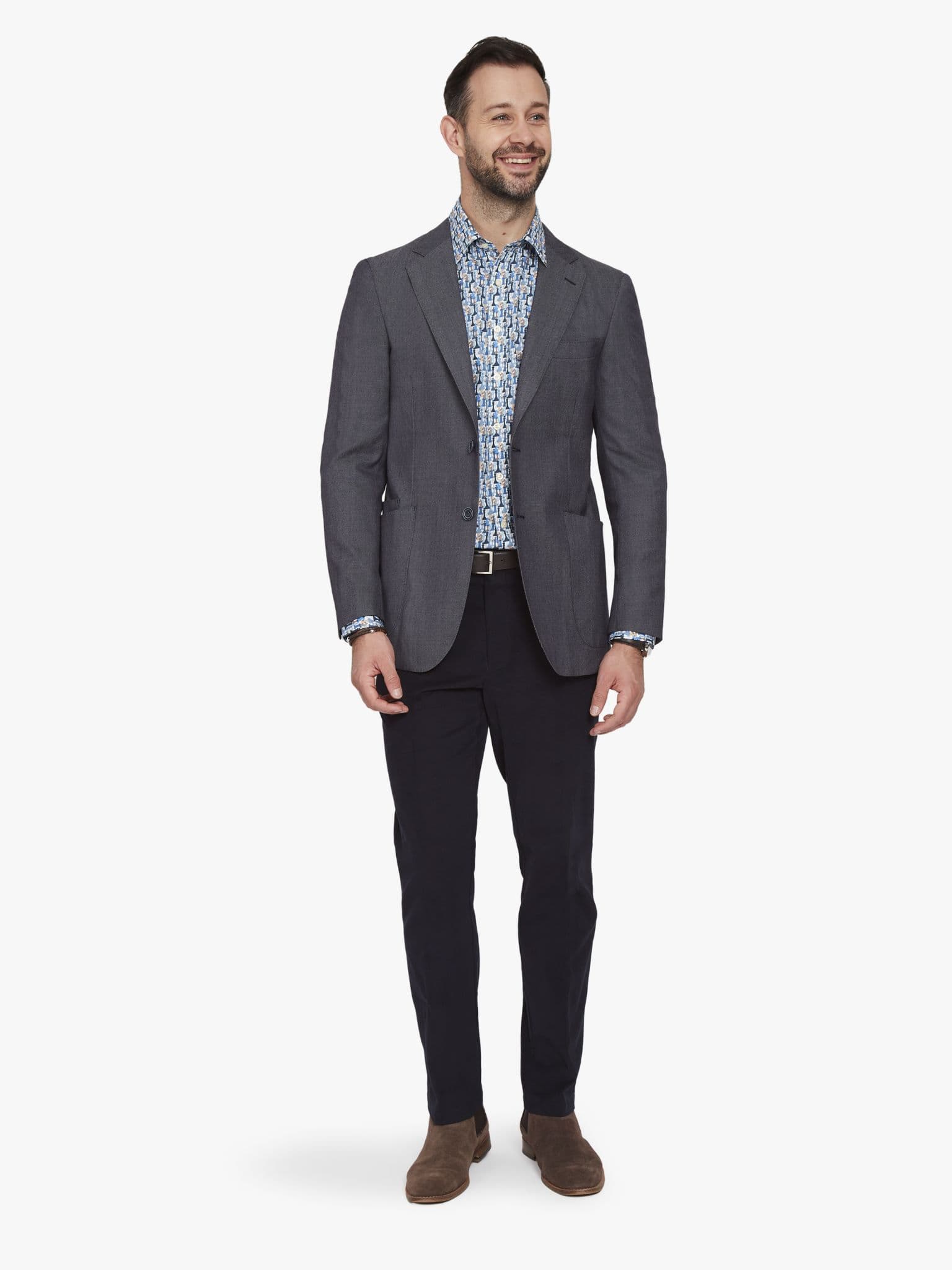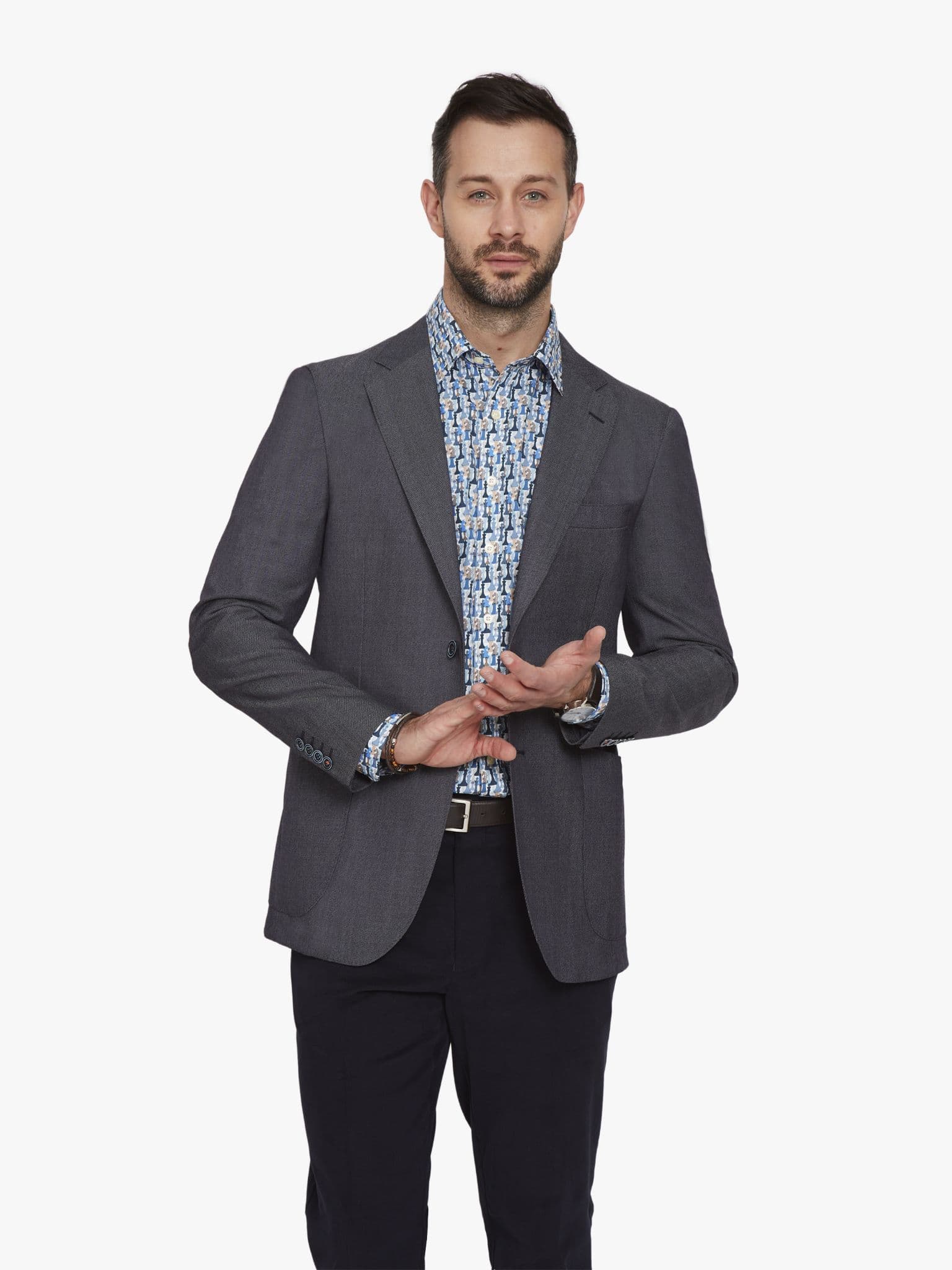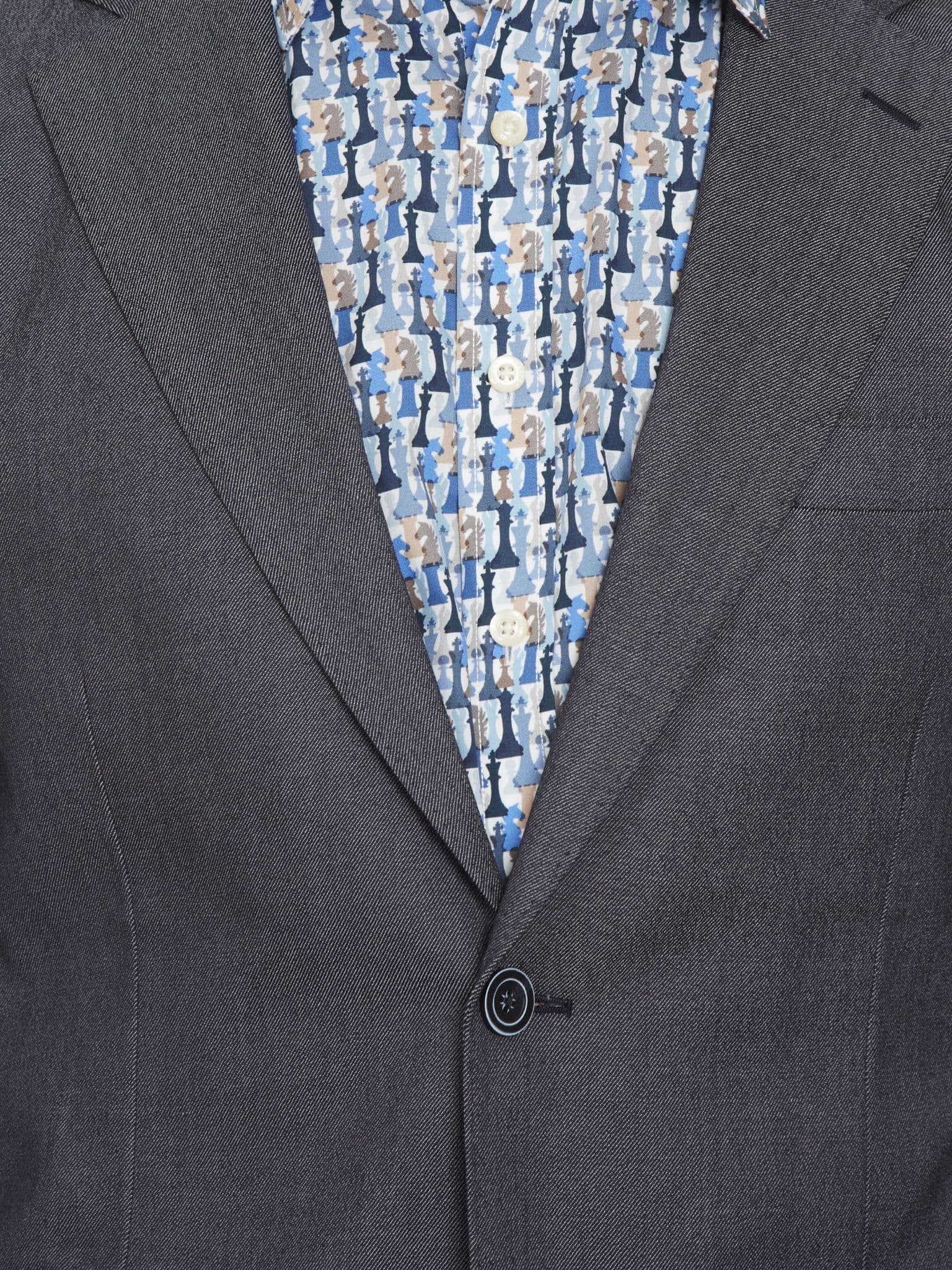 Heres another very exclusive jacket from Japan. I have a group of partners over there who produce clothing and accessories specifically for the Japanese market. We bring a few pieces to the UK each season, to sell in our London stores and online, but were talking tiny numbers so the odds of seeing someone else in my Japanese jacket are miniscule. The quality is superb; very exacting production standards mean that every stitch is perfect. The fabric has the appearance of denim, but its more subtle than that with a slight shimmer. The composition is wool, polyester and silk and being mostly unlined, it drapes softly and elegantly. Perfect with one of my signature bright shirts underneath.