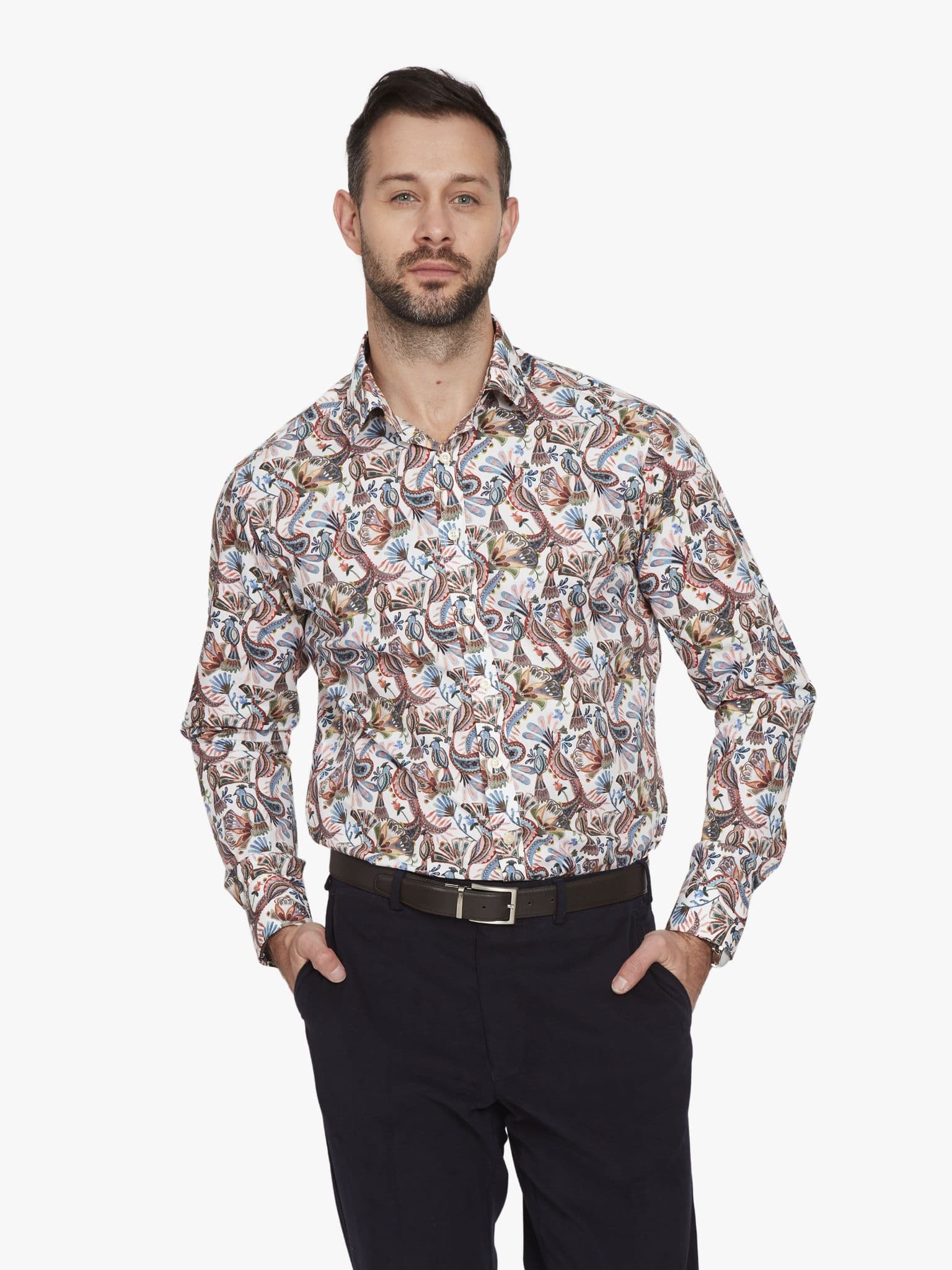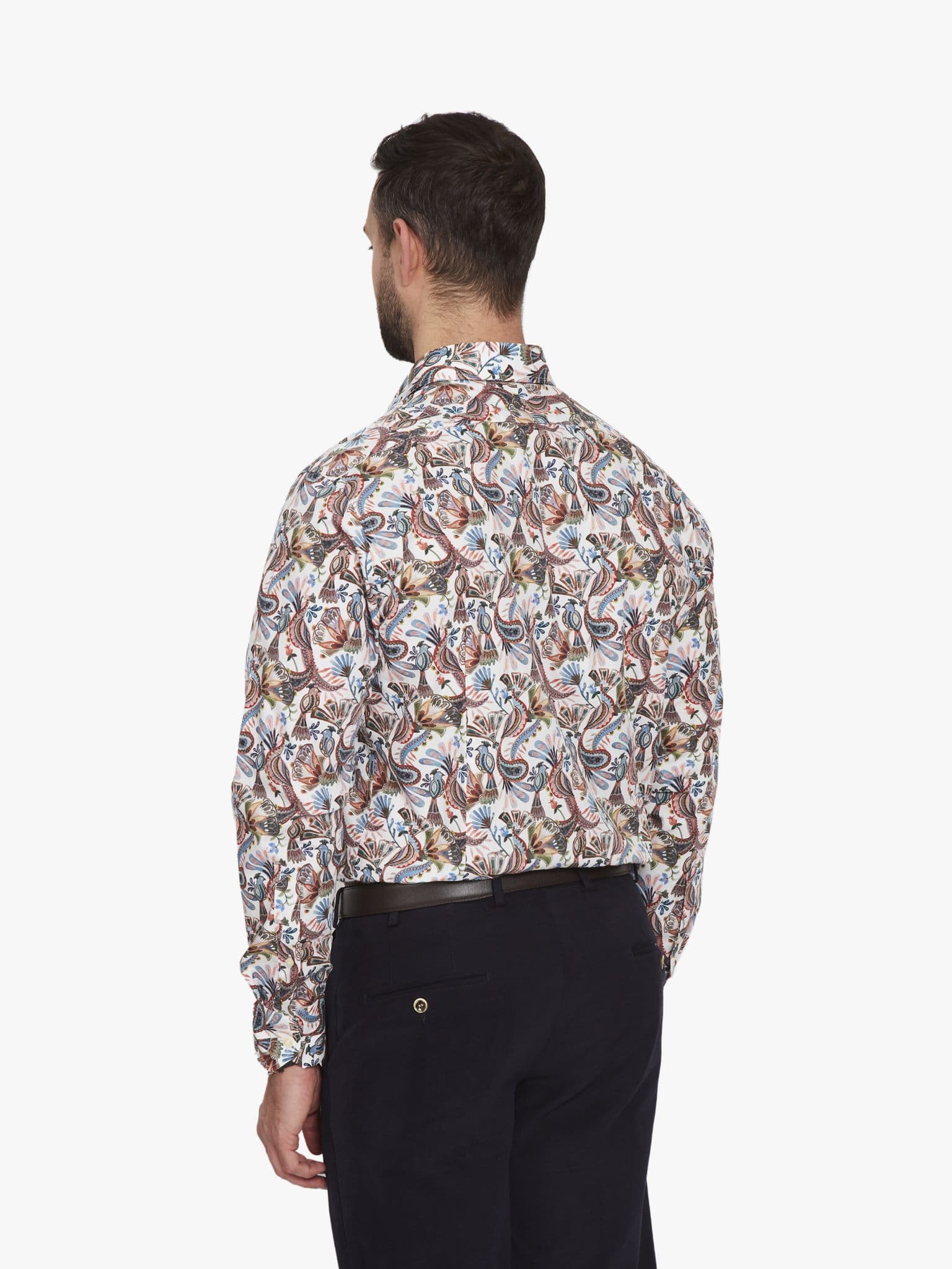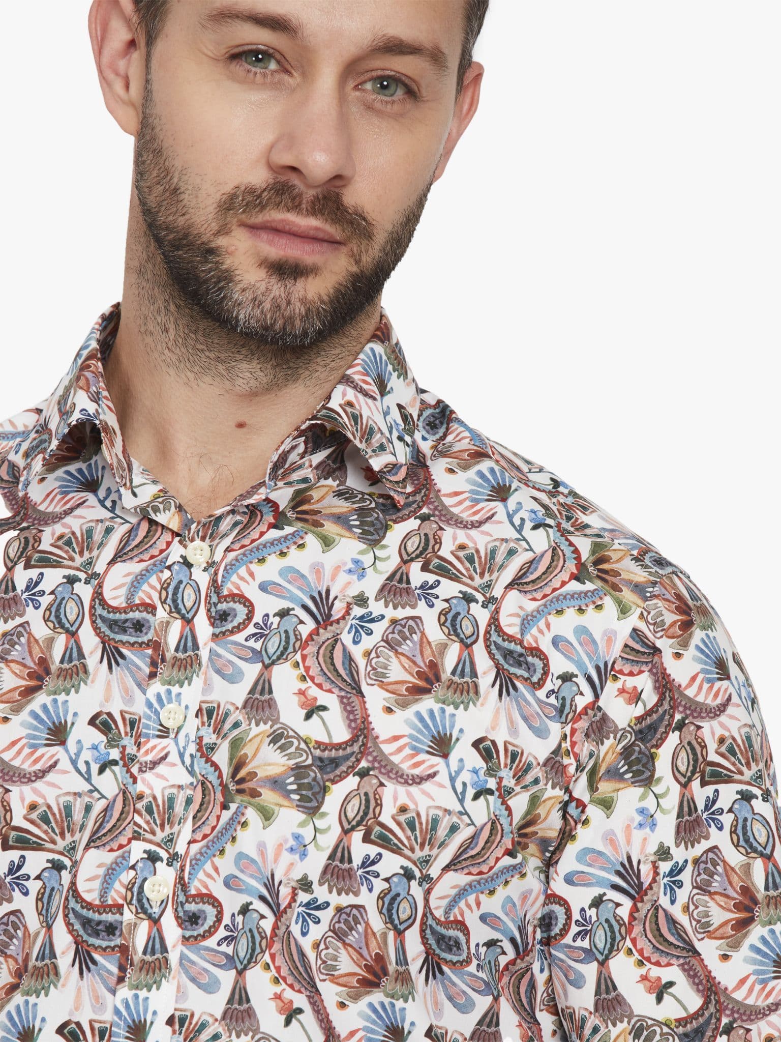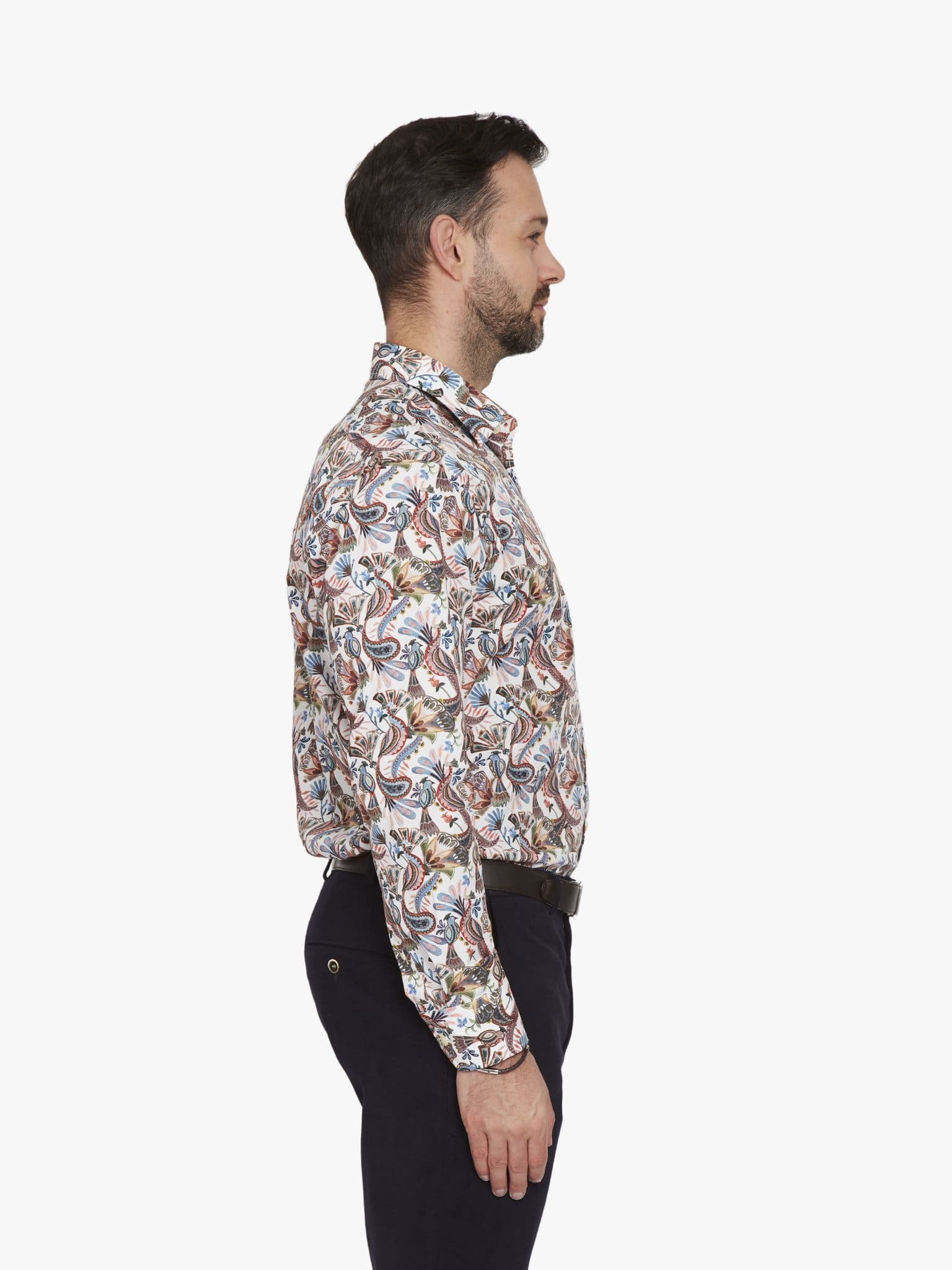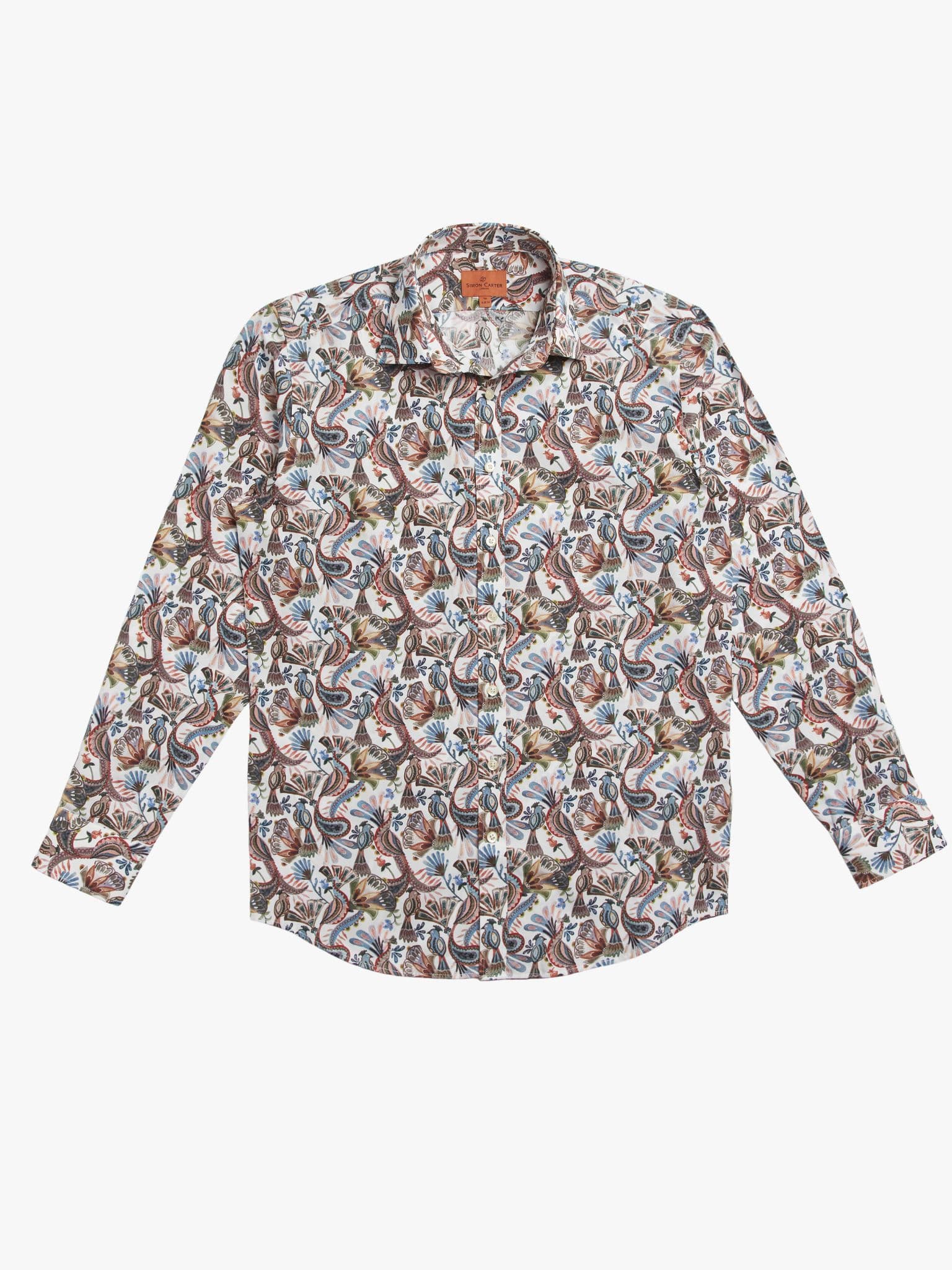 Its always a challenge to develop and design a new variation on Paisley, but here we just about take the biscuit. Classic ogee motifs morph into peacock tails while smaller cockatoos lurk in the colourful foliage. There's an almost abstract quality that renders this modern and playful. Perfect with anything blue, or with our new season lightweight high button red wool jacket. Made in Portugal from 100% cotton with a gently tailored fit.