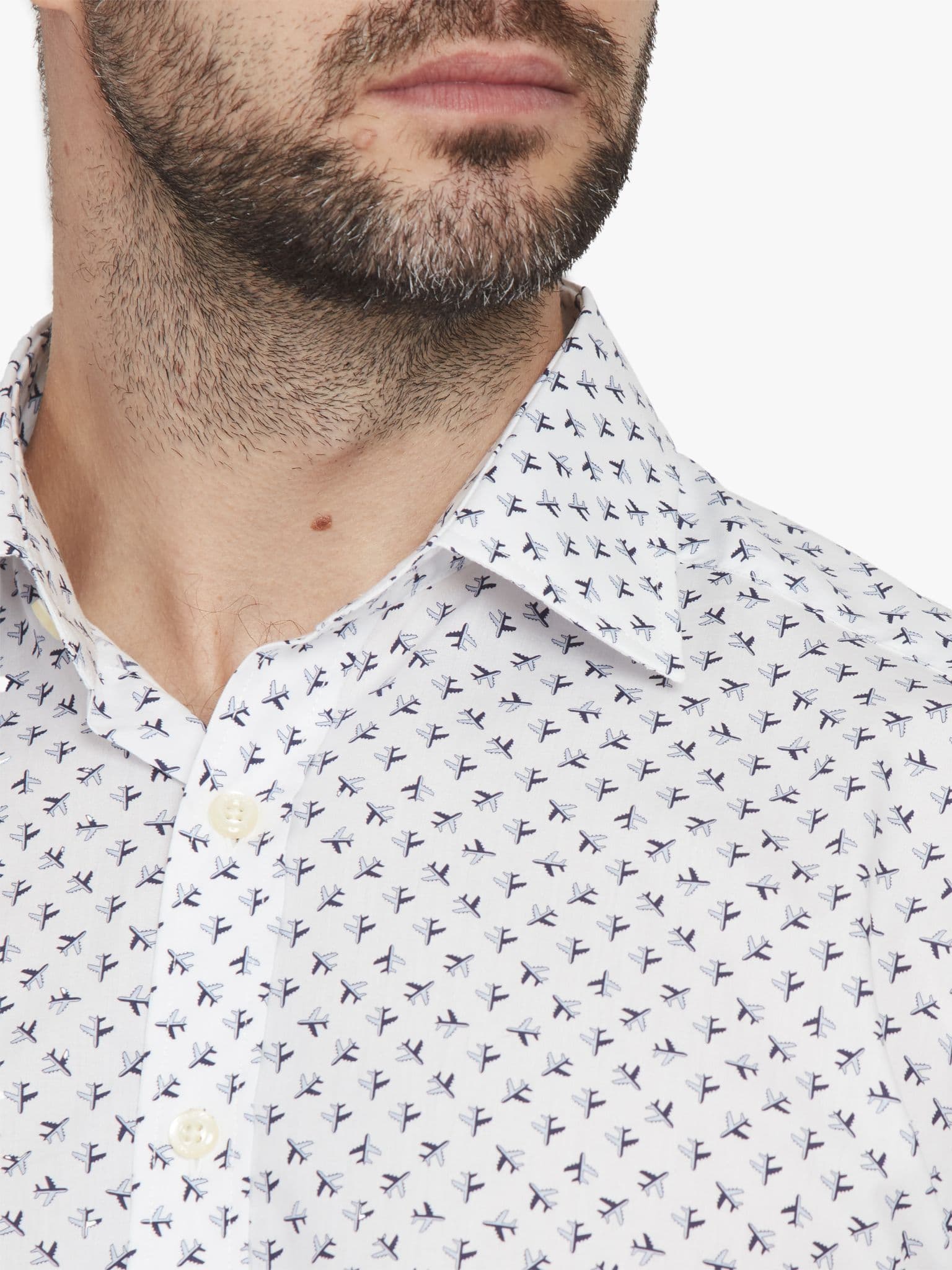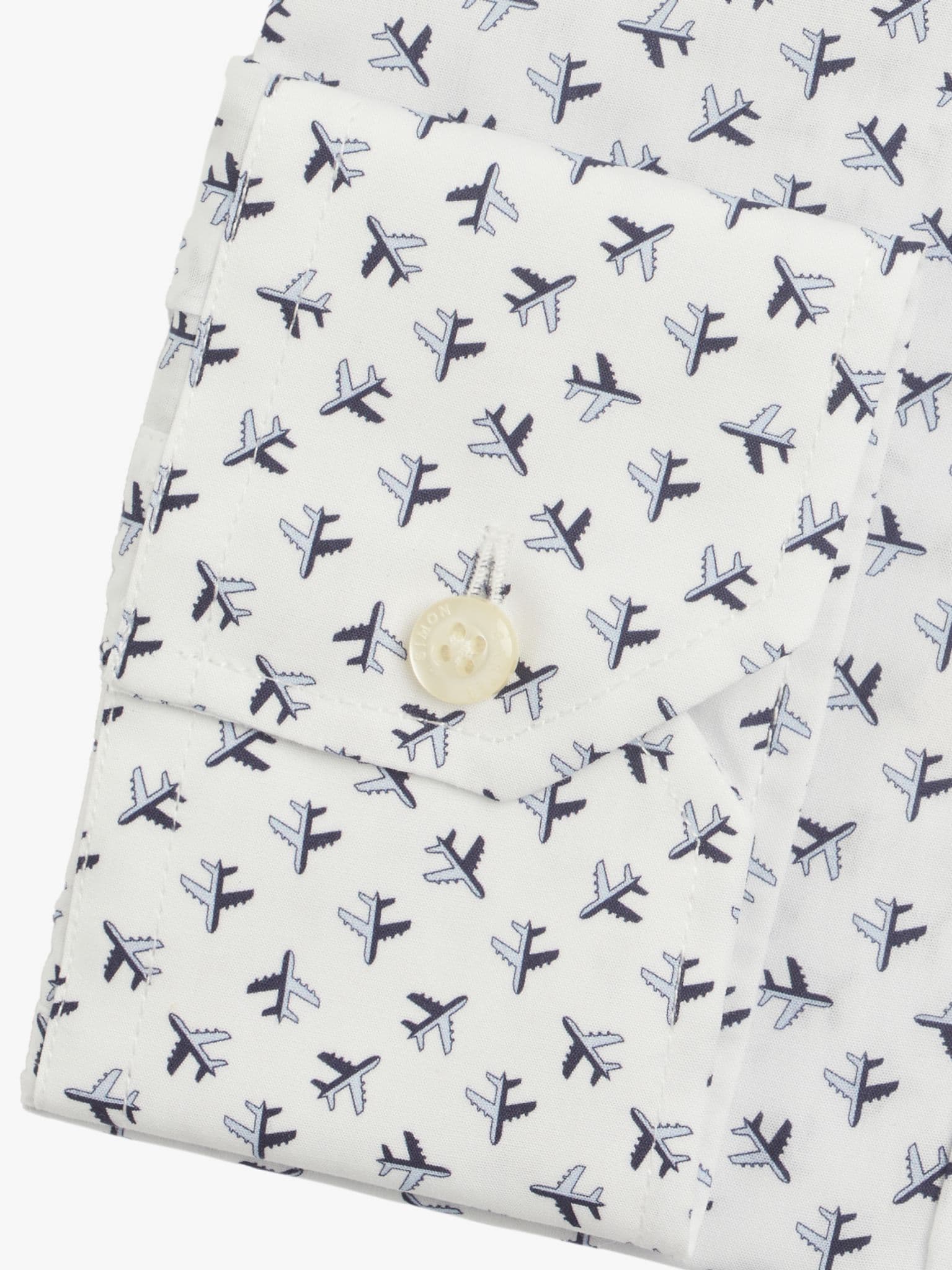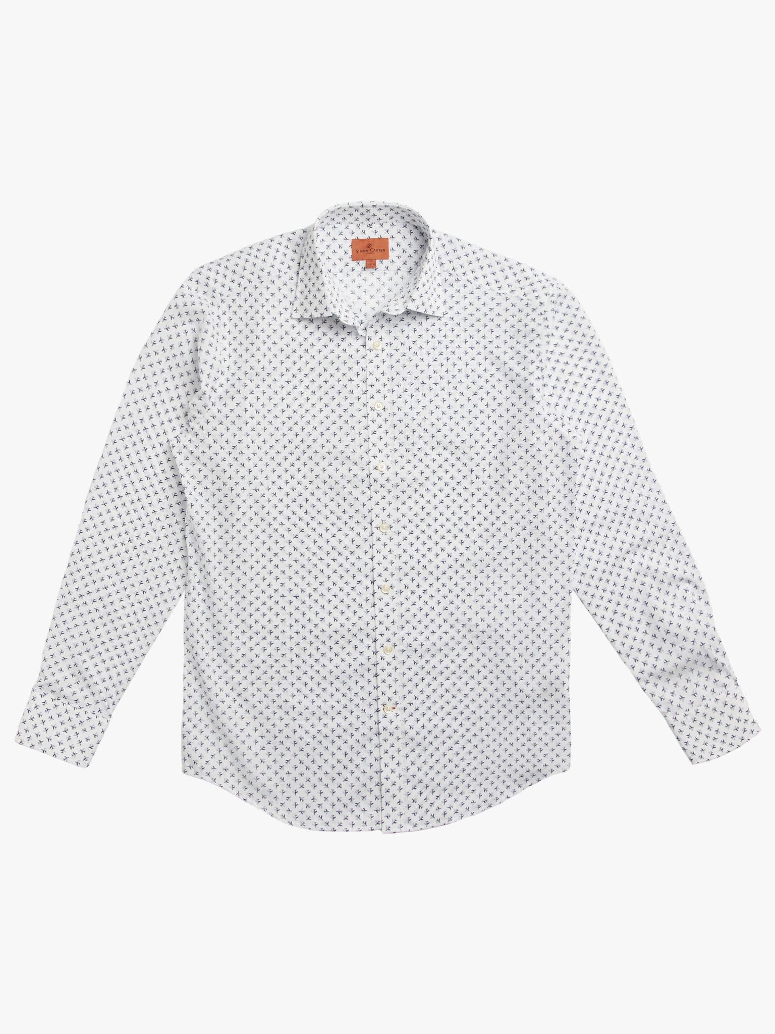 The fourth design in this seasons neat designs is micro planes. What lifts this above the simple graphic quality of a repeat motif is the clever way they're grouped. Look closer and you'll see there's a central aircraft with others radiating out. Further depth is given by casting half of each jet in shadow, giving a curious narrative quality to the whole design. 100% cotton, made in Portugal with a gently tailored fit.