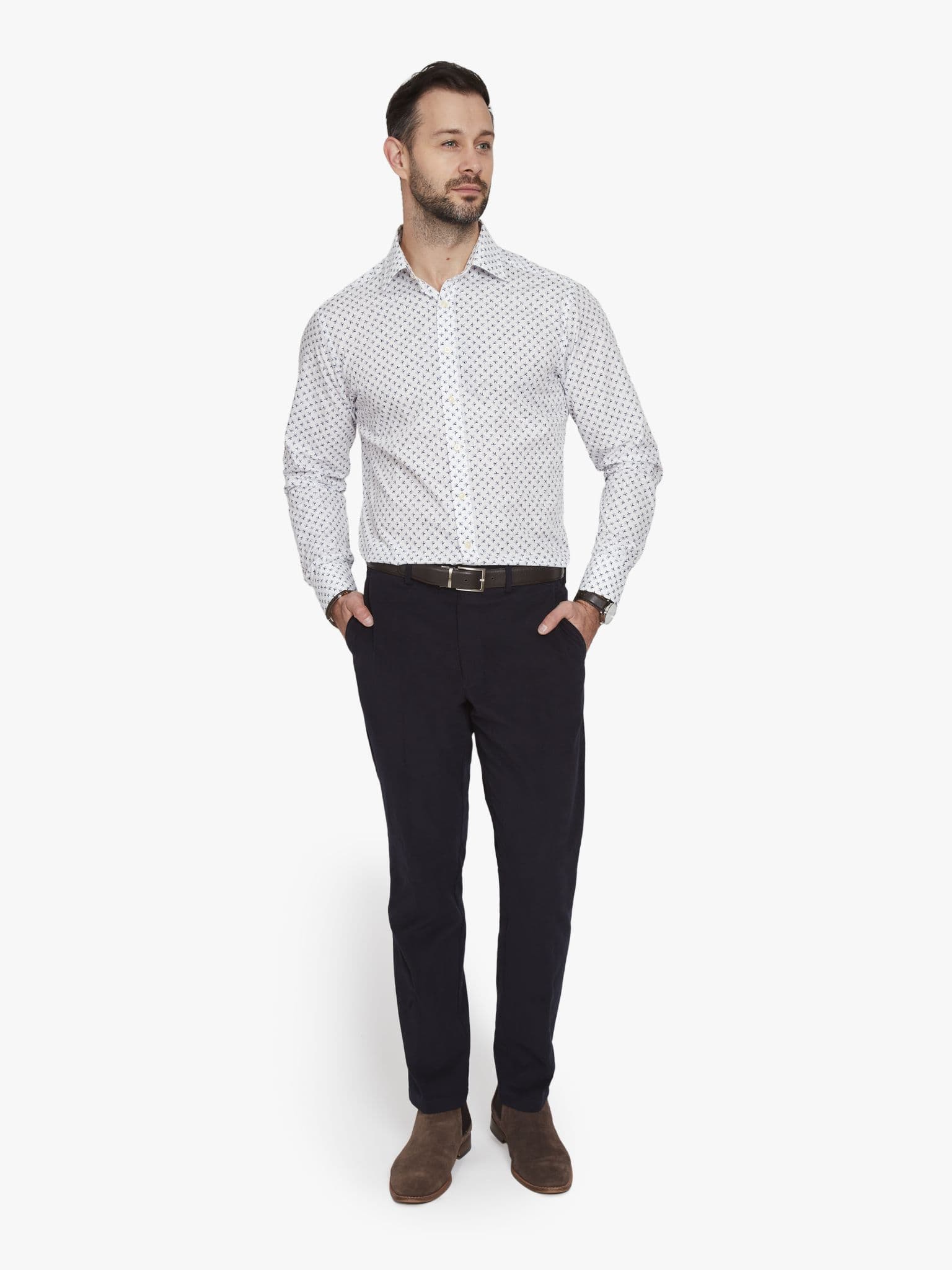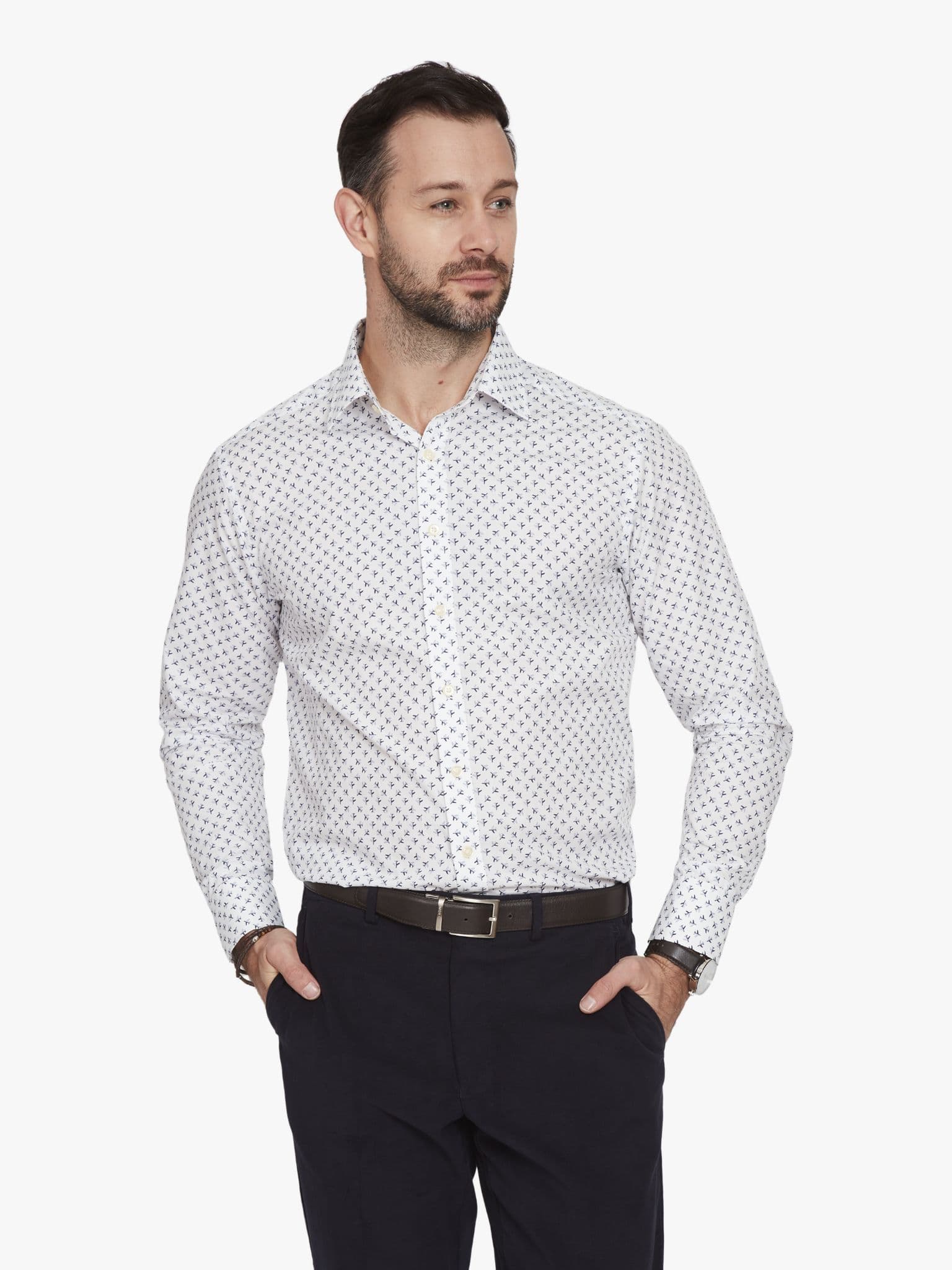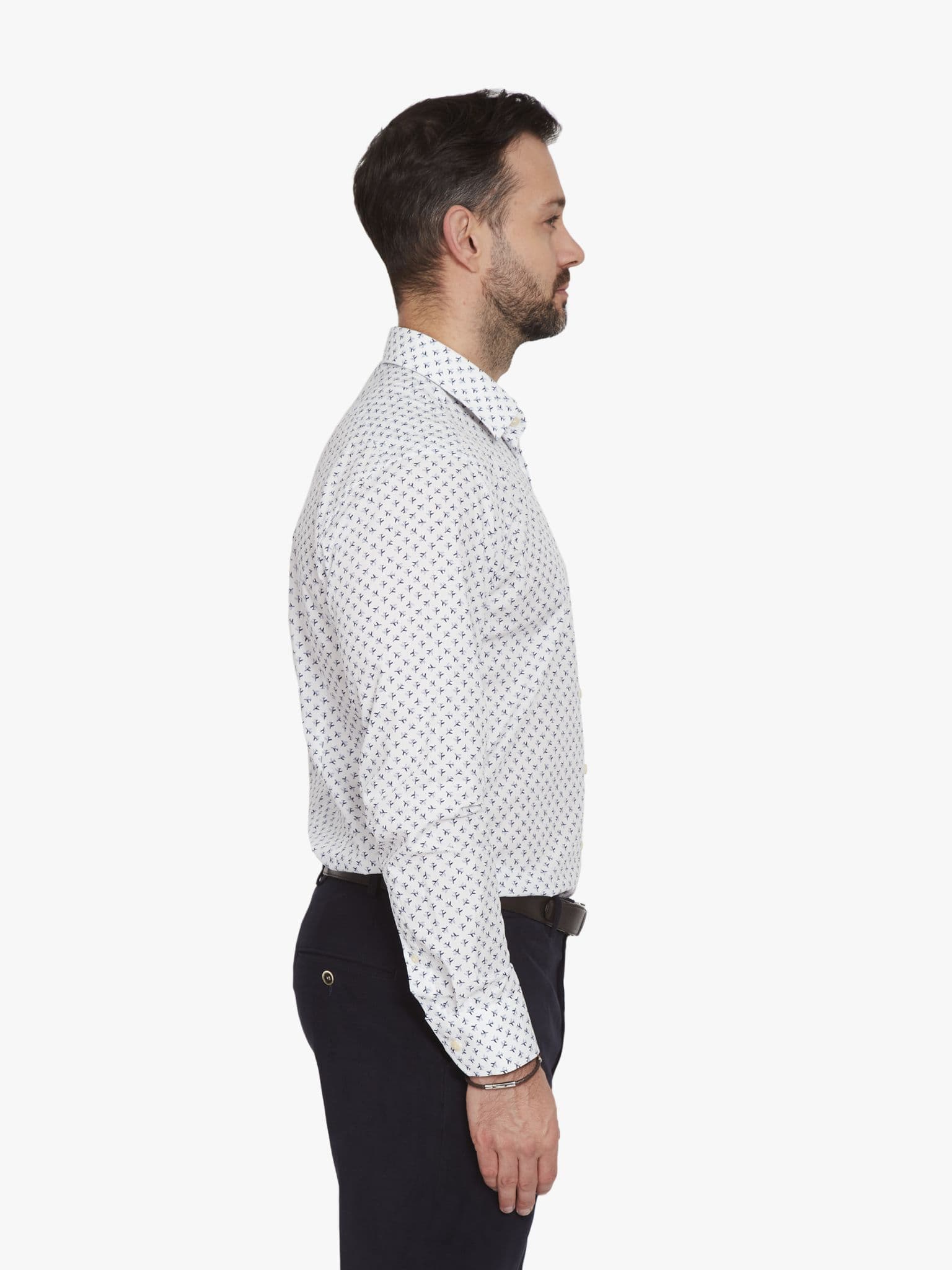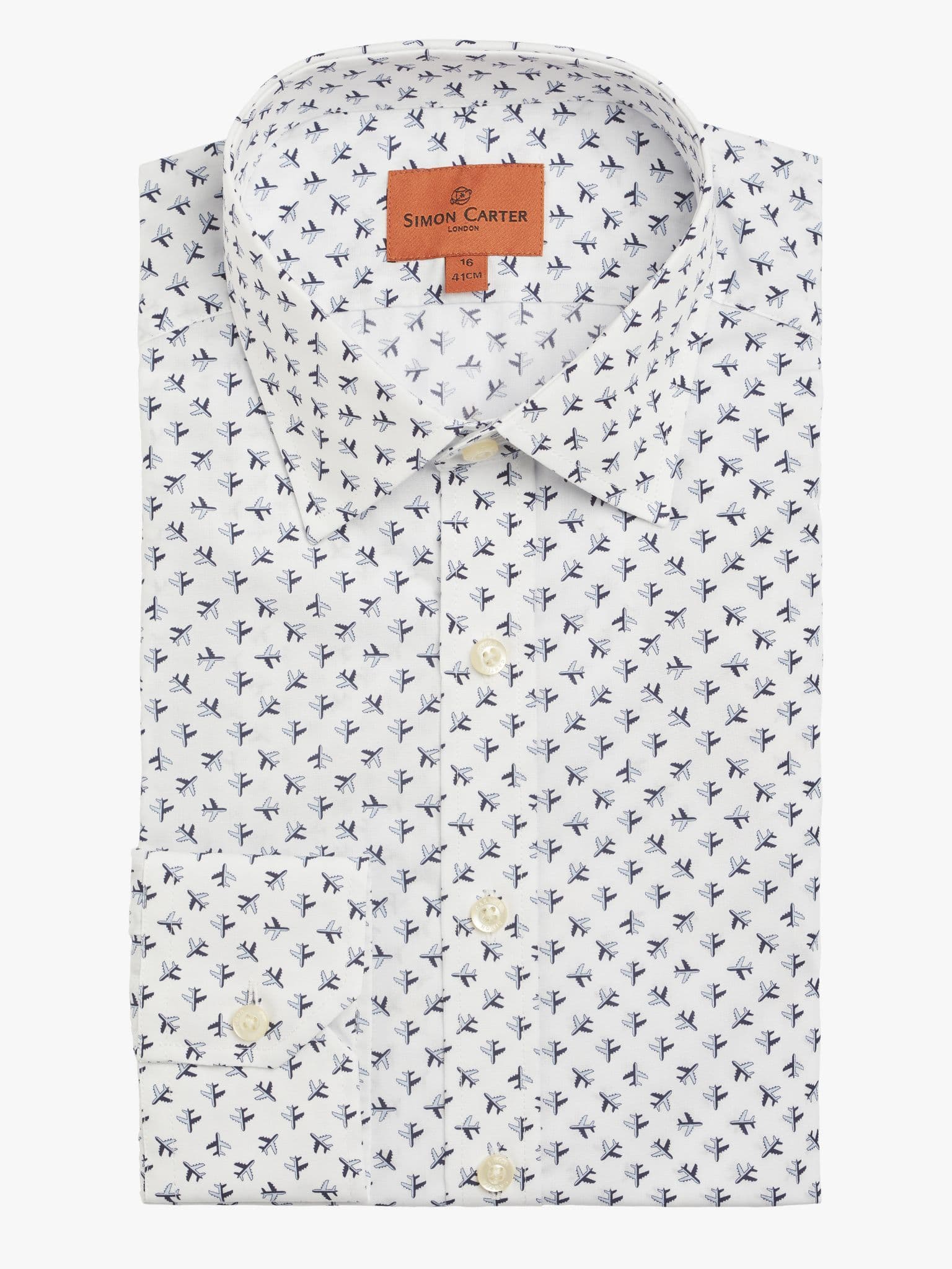 The fourth design in this seasons neat designs is micro planes. What lifts this above the simple graphic quality of a repeat motif is the clever way they're grouped. Look closer and you'll see there's a central aircraft with others radiating out. Further depth is given by casting half of each jet in shadow, giving a curious narrative quality to the whole design. 100% cotton, made in Portugal with a gently tailored fit.