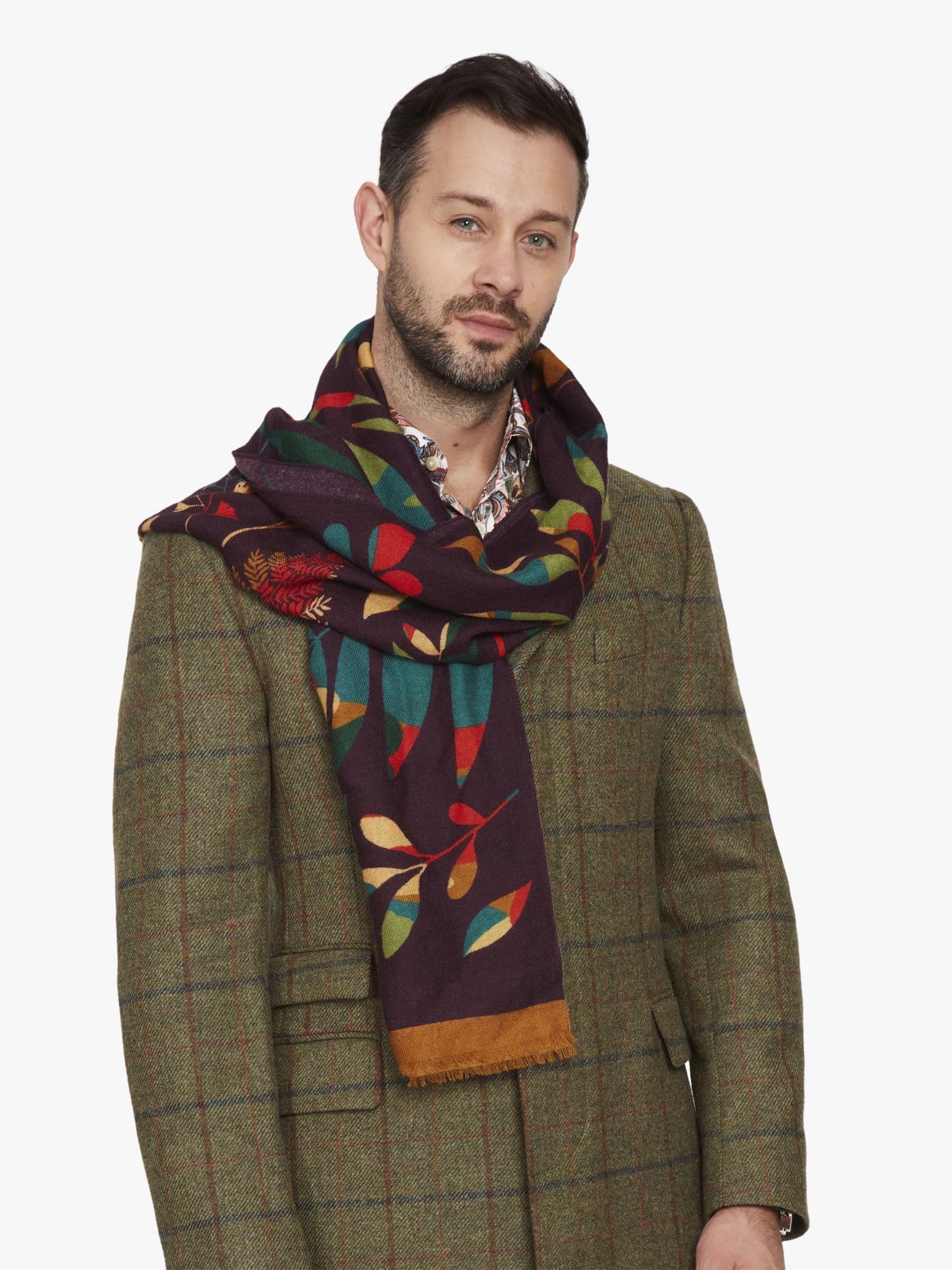 The scale of this scarf is striking. Vast oak leaves drift past fern sprigs and Eucalyptus. There's a sense of being caught in a storm in Kew Gardens. I love the way that the colours are so unexpected and seem to slice the motifs into chunks. The rich purple background is warm and cosy. The super fine merino wool feels so luxurious when tied around the neck. The scarf is a generous 1.9m long, and wraps up snug against your neck, allowing it to be tucked into a jacket or better still, one of our new season knits. Made in Italy from 100% merino wool.