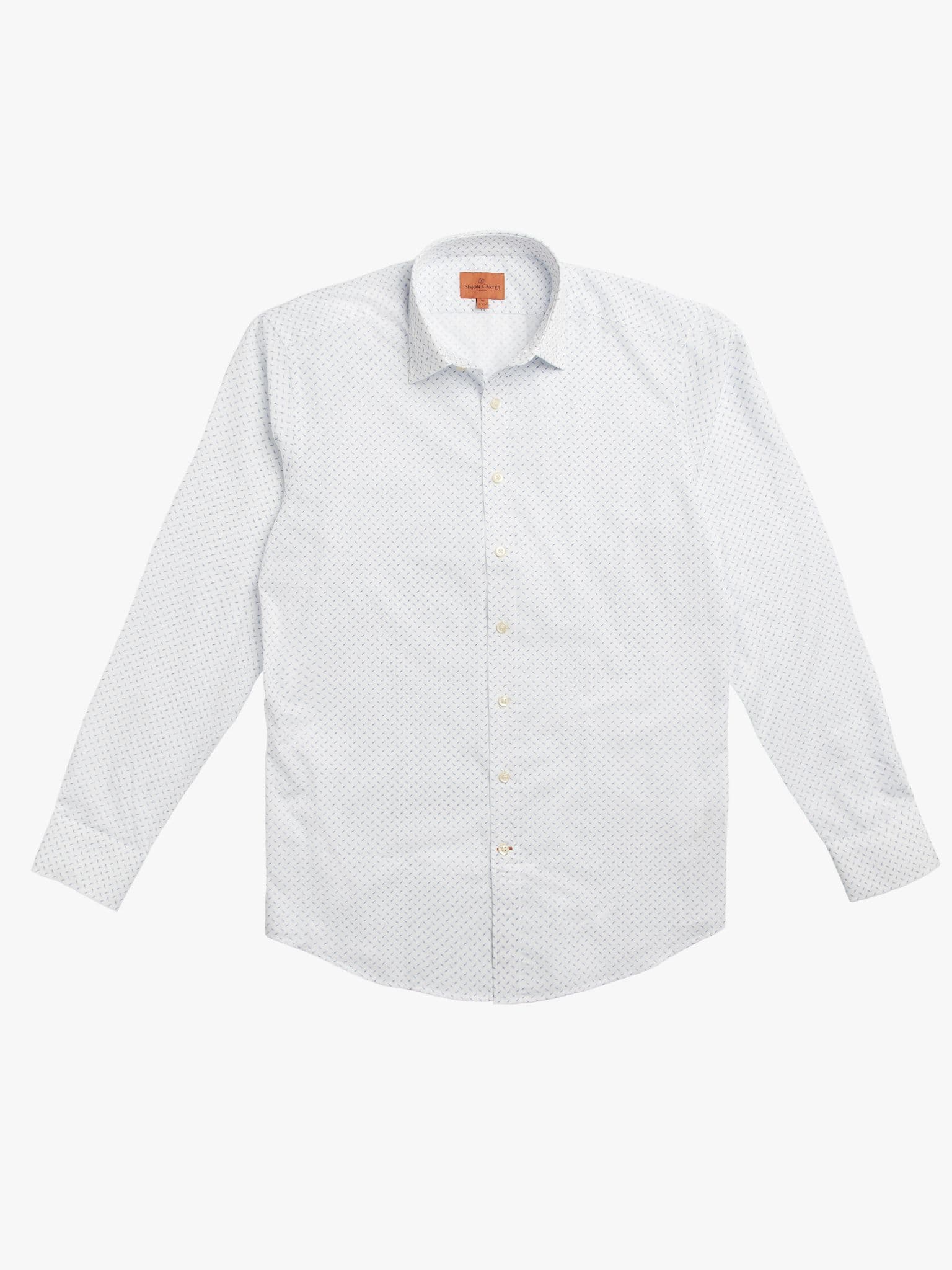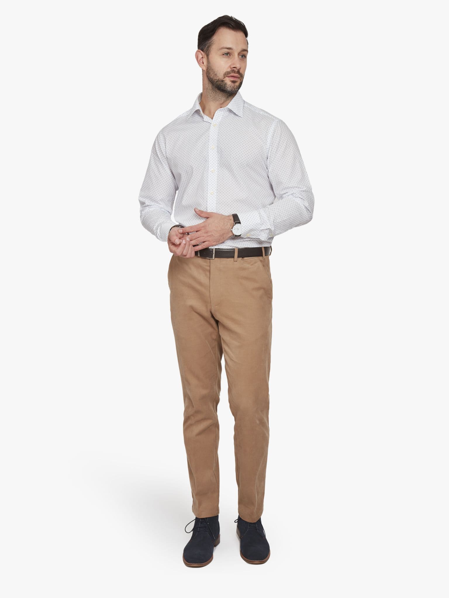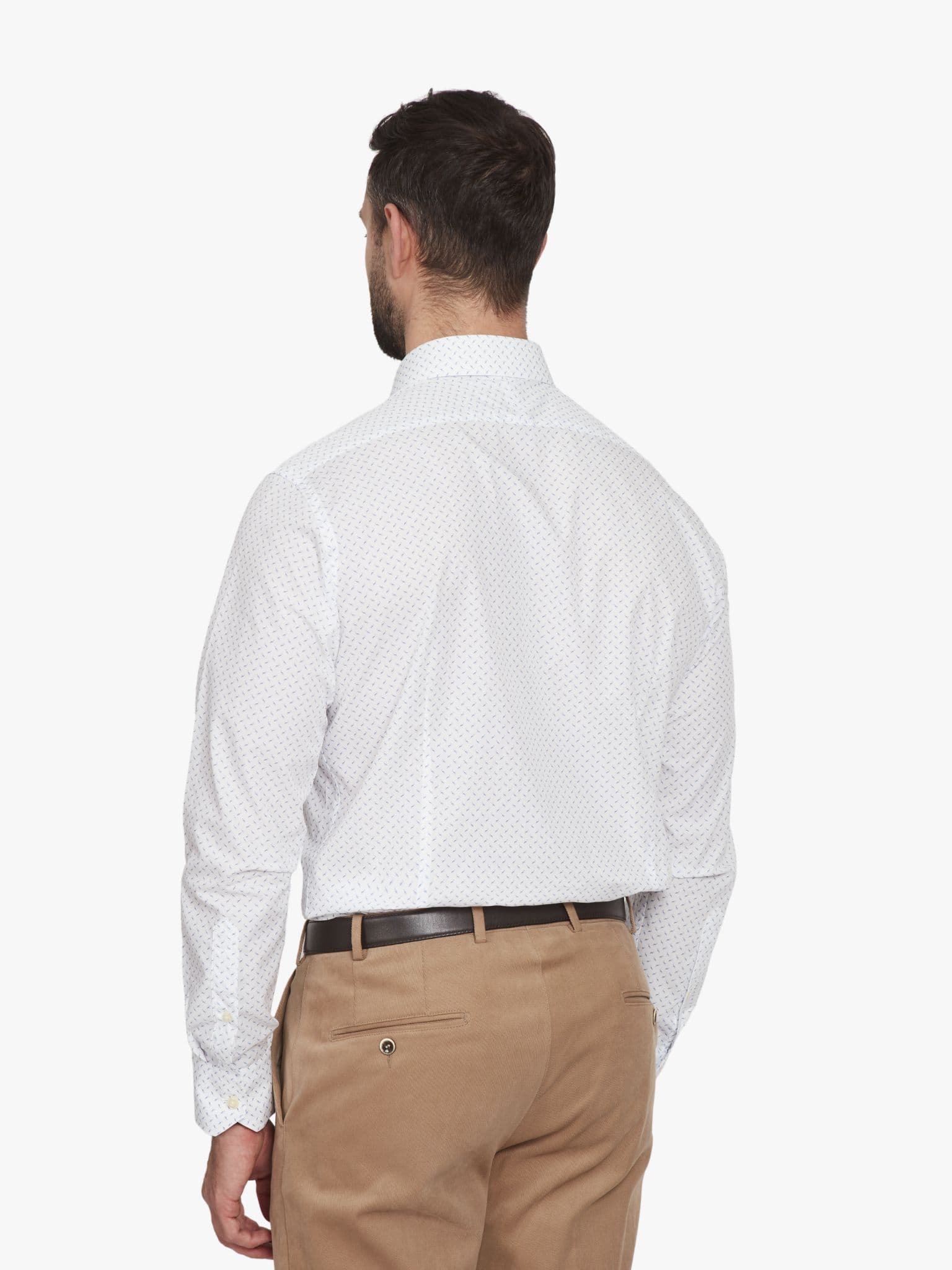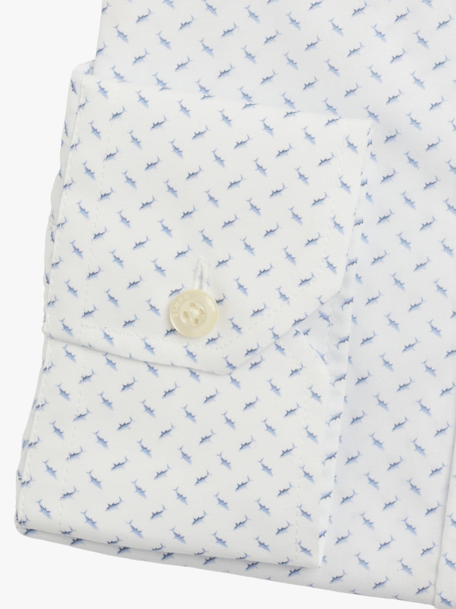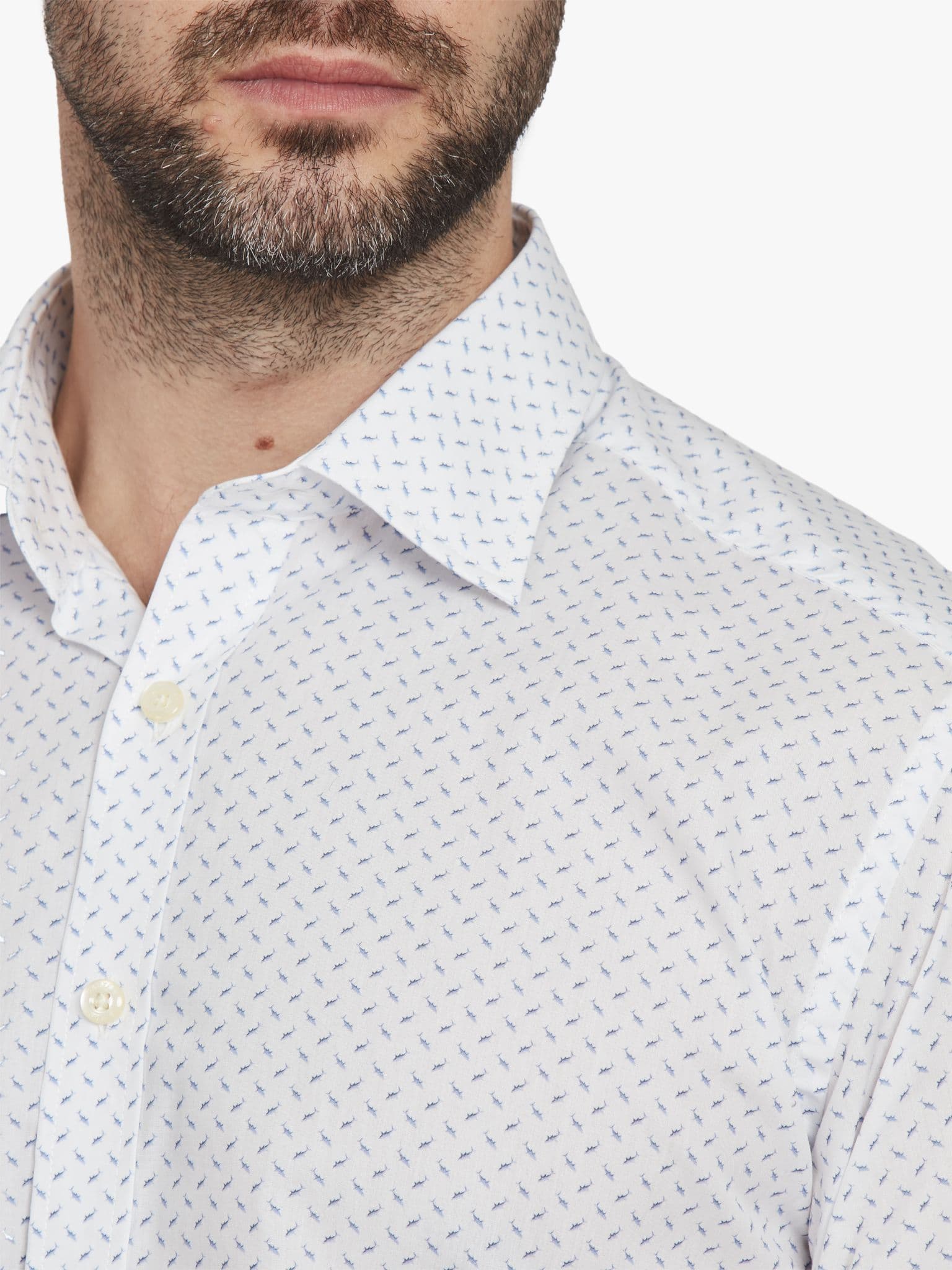 I've had to really restrain myself this season, resisting the urge to design vast, bold patterns (don't worry: there's still some on their way). Instead, I've scaled it right back to produce a collection of semi plains. You'll need to get very up-close and personal to see these tiny sharks basking on the surface of this classic fine white shirt. Somehow they look less sinister and dangerous at this scale, but don't be deceived.100% cotton, made in Portugal with a gently tailored fit.